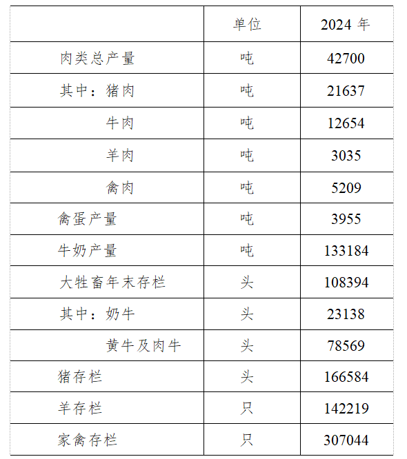 畜牧業(yè)總產(chǎn)值達230381萬元,按可比價計算,同比增長1.8%,占農(nóng)林牧漁業(yè)產(chǎn)值比重達到12.7%。主要畜產(chǎn)品產(chǎn)量和牲畜存欄如下: