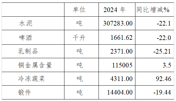 在主要工業(yè)產(chǎn)品產(chǎn)量中:銅產(chǎn)量較上年增長3.5%;水泥產(chǎn)量較上年下降22.1%;啤酒產(chǎn)量較上年下降22.0%。主要工業(yè)產(chǎn)品產(chǎn)量及增減情況如下: