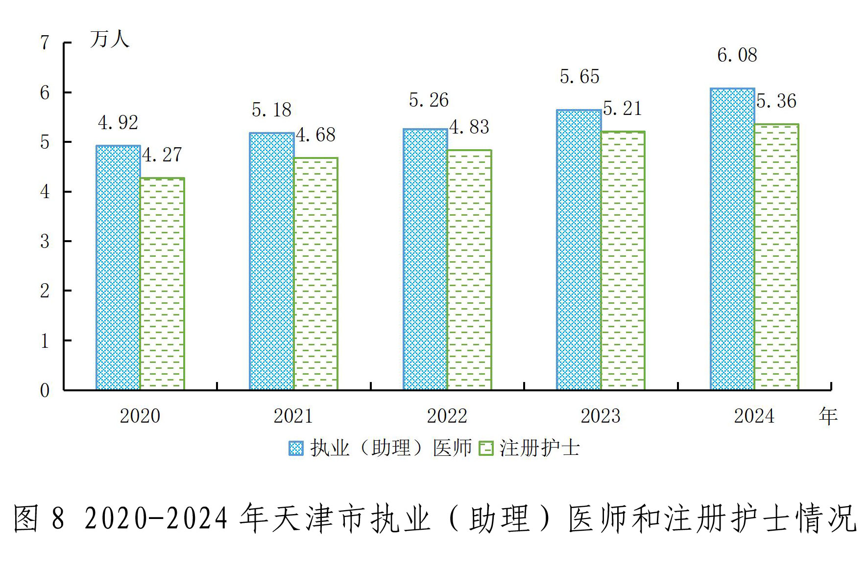 衛(wèi)生健康服務(wù)不斷優(yōu)化。天津中醫(yī)藥大學(xué)第一附屬醫(yī)院納入中醫(yī)國家醫(yī)學(xué)中心首批支持項(xiàng)目,市人民醫(yī)院擴(kuò)建三期住院樓等項(xiàng)目建成投用。截至年末,全市共有各類衛(wèi)生機(jī)構(gòu)6962個(gè),其中醫(yī)院453個(gè)。衛(wèi)生機(jī)構(gòu)床位7.32萬張,比上年增長1.0%,其中醫(yī)院床位6.72萬張,增長0.8%。衛(wèi)生技術(shù)人員13.90萬人,增長4.0%,其中執(zhí)業(yè)(助理)醫(yī)師6.08萬人,注冊護(hù)士5.36萬人,分別比上年增長7.6%和2.9%。醫(yī)療衛(wèi)生機(jī)構(gòu)診療人數(shù)12286.15萬人次,其中醫(yī)院診療人數(shù)7293.68萬人次。