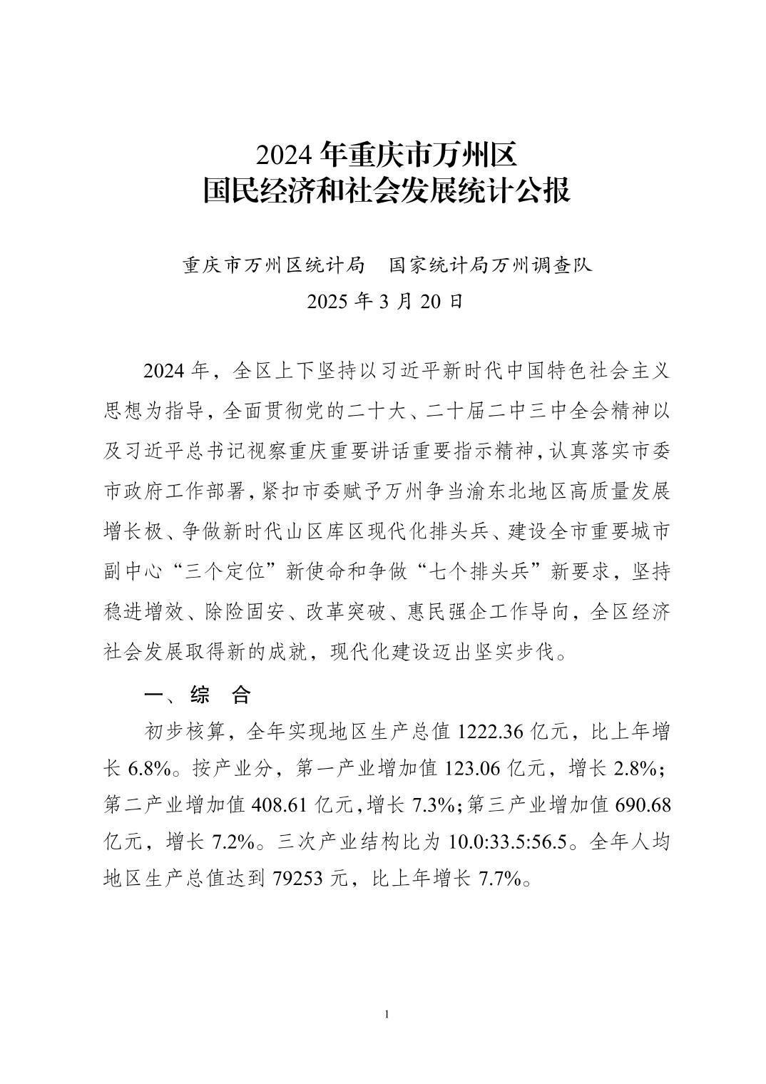 2024年重慶市萬州區(qū)人民政府國民經(jīng)濟和社會發(fā)展統(tǒng)計公報(2025年更新)