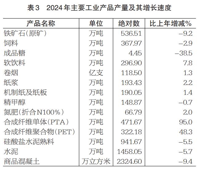 在八大工業(yè)支柱行業(yè)增加值中,農(nóng)副食品加工業(yè)增長(zhǎng)22.5%,造紙及紙制品業(yè)下降2.0%,石油加工業(yè)下降3.9%,化學(xué)原料和化學(xué)制品制造業(yè)增長(zhǎng)29.7%,醫(yī)藥制造業(yè)下降1.6%,非金屬礦物制品業(yè)下降7.2%,汽車(chē)制造業(yè)下降44.2%,電力、熱力的生產(chǎn)和供應(yīng)業(yè)增長(zhǎng)3.3%。主要工業(yè)產(chǎn)品產(chǎn)量及其增長(zhǎng)速度見(jiàn)表3。