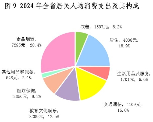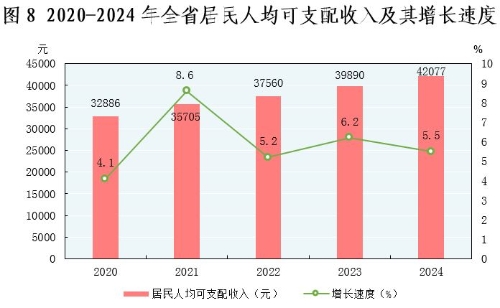 全年全省居民人均可支配收入42077元,比上年增長5.5%。其中,城鎮(zhèn)居民人均可支配收入54062元,增長4.8%;農(nóng)村居民人均可支配收入25257元,增長6.2%。全省居民人均消費支出25645元,增長5.6%。其中,城鎮(zhèn)居民人均消費支出31625元,增長4.5%;農(nóng)村居民人均消費支出17253元,增長7.3%。全省居民人均住房建筑面積43.7平方米。