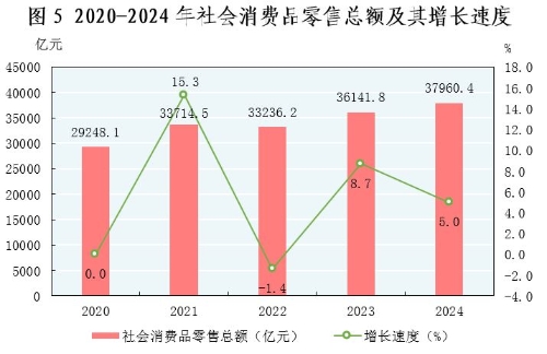 全年社會消費品零售總額37960.4億元,比上年增長5.0%。其中,餐飲收入4680.7億元,增長7.7%;商品零售額33279.7億元,增長4.7%。城鎮(zhèn)消費品零售額31842.8億元,增長4.9%;鄉(xiāng)村消費品零售額6117.6億元,增長5.8%。