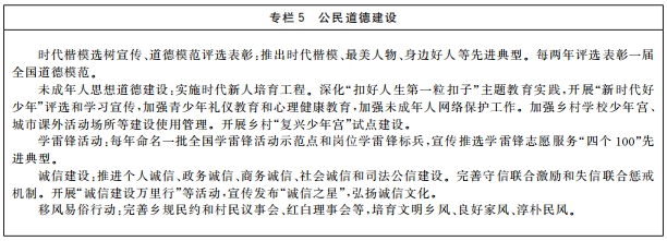 傳承弘揚(yáng)中華傳統(tǒng)美德,加強(qiáng)社會(huì)公德、職業(yè)道德、家庭美德、個(gè)人品德建設(shè),加強(qiáng)家庭、家教、家風(fēng)建設(shè)。加強(qiáng)對(duì)革命、建設(shè)、改革時(shí)期各類先進(jìn)典型的學(xué)習(xí)宣傳,尊崇褒揚(yáng)英雄模范,關(guān)心關(guān)愛先進(jìn)典型人物。健全家庭、學(xué)校、政府、社會(huì)相結(jié)合的思想道德教育體系,把立德樹人貫穿學(xué)校教育全過程。發(fā)揮優(yōu)秀文化產(chǎn)品陶冶道德情操的作用,完善市民公約、鄉(xiāng)規(guī)民約、學(xué)生守則、團(tuán)體章程等社會(huì)規(guī)范,廣泛開展弘揚(yáng)時(shí)代新風(fēng)行動(dòng),深化道德領(lǐng)域突出問題治理。加強(qiáng)農(nóng)村思想道德建設(shè),創(chuàng)新文化科技衛(wèi)生“三下鄉(xiāng)”長(zhǎng)效機(jī)制。