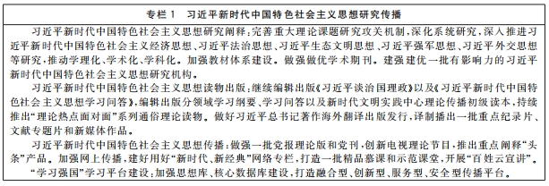 把習(xí)近平新時(shí)代中國特色社會(huì)主義思想貫穿哲學(xué)社會(huì)科學(xué)各領(lǐng)域各學(xué)科,加快構(gòu)建中國特色哲學(xué)社會(huì)科學(xué),推進(jìn)學(xué)科體系、學(xué)術(shù)體系、話語體系建設(shè)和創(chuàng)新。加強(qiáng)頂層設(shè)計(jì)和統(tǒng)籌協(xié)調(diào),制定中長(zhǎng)期發(fā)展規(guī)劃。加強(qiáng)學(xué)科基礎(chǔ)理論建設(shè),打造具有中國特色的理論學(xué)派。深化當(dāng)代中國馬克思主義政治經(jīng)濟(jì)學(xué)研究。堅(jiān)持問題導(dǎo)向,圍繞事關(guān)黨和國家事業(yè)發(fā)展全局的戰(zhàn)略問題,推出一批扎根中國大地、聚焦偉大實(shí)踐、反映時(shí)代特征的原創(chuàng)性、標(biāo)志性科研成果,推動(dòng)重大學(xué)術(shù)成果國際化傳播。培育高效整合國內(nèi)外學(xué)術(shù)資源、引領(lǐng)學(xué)科創(chuàng)新發(fā)展的學(xué)術(shù)平臺(tái)。充分發(fā)揮國家社會(huì)科學(xué)基金示范引導(dǎo)作用。深入推進(jìn)中國特色新型智庫建設(shè)。