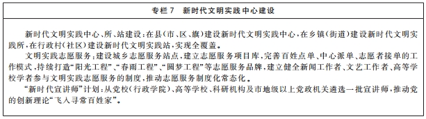 以實(shí)施文明創(chuàng)建工程為抓手,推動(dòng)文明培育、文明實(shí)踐、文明創(chuàng)建不斷深入。創(chuàng)造性開展文明城市、文明村鎮(zhèn)、文明單位、文明家庭、文明校園和未成年人思想道德建設(shè)工作先進(jìn)等精神文明創(chuàng)建活動(dòng),拓展新時(shí)代文明實(shí)踐中心建設(shè)。弘揚(yáng)科學(xué)精神,深入開展愛國衛(wèi)生運(yùn)動(dòng),深化文明餐桌行動(dòng)和“光盤行動(dòng)”,倡導(dǎo)文明健康、綠色環(huán)保的生活方式。健全志愿服務(wù)體系,廣泛開展志愿服務(wù)關(guān)愛行動(dòng)。加強(qiáng)網(wǎng)絡(luò)文明建設(shè)。