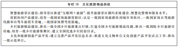 適應(yīng)大眾旅游時(shí)代新要求,推進(jìn)旅游為民,推動(dòng)構(gòu)建類型多樣、分布均衡、特色鮮明、品質(zhì)優(yōu)良的旅游供給體系,推動(dòng)文化和旅游業(yè)態(tài)融合、產(chǎn)品融合、市場(chǎng)融合。提升旅游演藝、文化遺產(chǎn)旅游、文化主題酒店、特色節(jié)慶展會(huì)等品質(zhì),支持建設(shè)集文化創(chuàng)意、旅游休閑等于一體的文化和旅游綜合體。依托革命博物館、黨史館、紀(jì)念館、革命遺址遺存遺跡等,打造紅色旅游經(jīng)典景區(qū)和經(jīng)典線路。利用鄉(xiāng)村文化傳統(tǒng)和資源,發(fā)展鄉(xiāng)村旅游。加強(qiáng)對(duì)當(dāng)代社會(huì)主義建設(shè)成就的旅游開發(fā),深入挖掘重大工程項(xiàng)目的精神內(nèi)涵,發(fā)展特色旅游。加強(qiáng)對(duì)工業(yè)遺產(chǎn)資源的活化利用,開發(fā)旅游用品、特色旅游商品,培育旅游裝備制造業(yè),發(fā)展工業(yè)旅游。推動(dòng)旅游與現(xiàn)代生產(chǎn)生活有機(jī)結(jié)合,加快發(fā)展度假休閑旅游、康養(yǎng)旅游、研學(xué)實(shí)踐活動(dòng)等,打造一批國家全域旅游示范區(qū)、A級(jí)旅游景區(qū)、國家級(jí)旅游度假區(qū)、國家精品旅游帶、國家旅游風(fēng)景道、特色旅游目的地、特色旅游功能區(qū)、城市綠道、騎行公園和慢行系統(tǒng)。大力發(fā)展智慧旅游,推進(jìn)智慧景區(qū)、度假區(qū)建設(shè)。