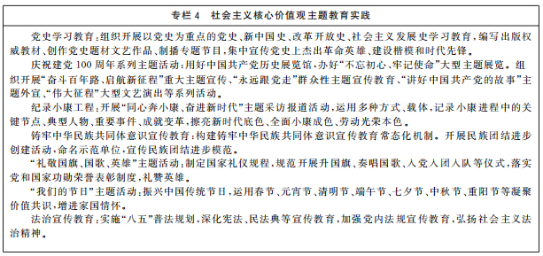 持續(xù)深化社會(huì)主義核心價(jià)值觀宣傳教育,增進(jìn)認(rèn)知認(rèn)同、樹立鮮明導(dǎo)向、強(qiáng)化示范帶動(dòng)。堅(jiān)持貫穿結(jié)合融入、落細(xì)落小落實(shí),把社會(huì)主義核心價(jià)值觀要求融入日常生活,融入法治建設(shè)。推動(dòng)理想信念教育常態(tài)化制度化,筑牢黨員干部、青少年等重點(diǎn)群體的理想信念之基。圍繞“七一”、“八一”、“十一”等重大時(shí)間節(jié)點(diǎn),依托革命歷史類紀(jì)念設(shè)施、遺址和愛國主義教育基地等載體,加強(qiáng)愛國主義、集體主義、社會(huì)主義教育,弘揚(yáng)黨和人民在各個(gè)歷史時(shí)期奮斗中形成的偉大精神。加強(qiáng)公益廣告宣傳。統(tǒng)籌開展誠信教育、勤儉節(jié)約教育、勞動(dòng)創(chuàng)造幸福主題宣傳教育。強(qiáng)化祖國統(tǒng)一和民族團(tuán)結(jié)進(jìn)步宣傳教育,深化“一國兩制”實(shí)踐教育,強(qiáng)化全民國防教育,促進(jìn)平安中國建設(shè)。