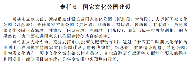推進(jìn)國(guó)家文化公園建設(shè),生動(dòng)呈現(xiàn)中華文化的獨(dú)特創(chuàng)造、價(jià)值理念和鮮明特色,樹立和突出各民族共享的中華文化符號(hào)和中華民族形象,探索新時(shí)代文物和文化資源保護(hù)傳承利用新路徑,把國(guó)家文化公園建設(shè)成為傳承中華文明的歷史文化走廊、中華民族共同精神家園、提升人民生活品質(zhì)的文化和旅游體驗(yàn)空間。加快建設(shè)長(zhǎng)城、大運(yùn)河、長(zhǎng)征、黃河等國(guó)家文化公園,整合具有突出意義、重要影響、重大主題的文物和文化資源,重點(diǎn)建設(shè)管控保護(hù)、主題展示、文旅融合、傳統(tǒng)利用四類主體功能區(qū),實(shí)施保護(hù)傳承、研究發(fā)掘、環(huán)境配套、文旅融合、數(shù)字再現(xiàn)五大工程,突出“萬(wàn)里長(zhǎng)城”、“千年運(yùn)河”、“兩萬(wàn)五千里長(zhǎng)征”、“九曲黃河”整體辨識(shí)度。推進(jìn)優(yōu)質(zhì)文化旅游資源一體化開發(fā),科學(xué)規(guī)劃、開發(fā)文化旅游產(chǎn)品和商品。推出參觀游覽聯(lián)程聯(lián)運(yùn)經(jīng)典線路,開展整體品牌塑造和營(yíng)銷推介。