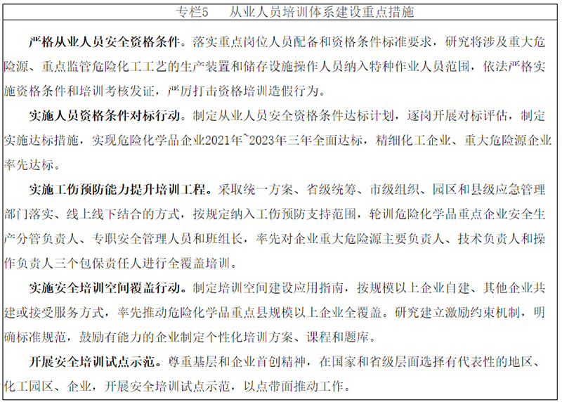 提升重點崗位操作人員安全技能。調(diào)整擴(kuò)充危險化學(xué)品特種作業(yè)人員范圍,嚴(yán)格依法實施資格條件和培訓(xùn)考試、持證上崗制度。建立健全實際操作訓(xùn)練基地建設(shè)標(biāo)準(zhǔn)、設(shè)備配備標(biāo)準(zhǔn)和以實際工作情景為導(dǎo)向的訓(xùn)練指導(dǎo)手冊,突出加強(qiáng)重點崗位人員實操訓(xùn)練。強(qiáng)化校企合作人才培養(yǎng),探索中國特色學(xué)徒制,從根本上解決產(chǎn)業(yè)工人來源問題。與人力資源社會保障等部門合作,按規(guī)定利用職業(yè)技能提升行動和工傷預(yù)防政策,扎實推進(jìn)化工行業(yè)安全技能提升行動和工傷預(yù)防能力提升培訓(xùn)工程。