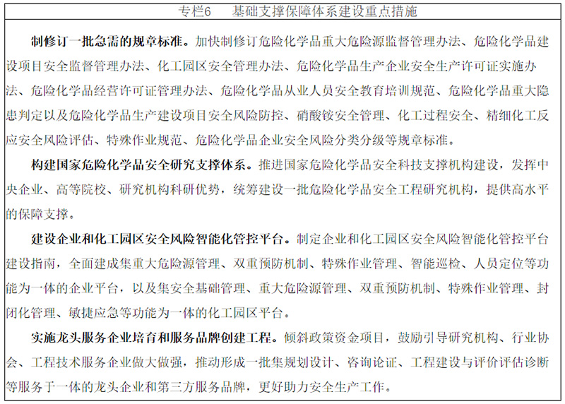 加強(qiáng)政策支持引導(dǎo),積極拓寬渠道,推動地方、化工園區(qū)、企業(yè)單位加大投入,實施一批危險化學(xué)品安全基礎(chǔ)設(shè)施和企業(yè)安全改造重大工程項目,形成以企業(yè)為主體、地方多種形式支持、社會力量積極參與的多元投入機(jī)制。