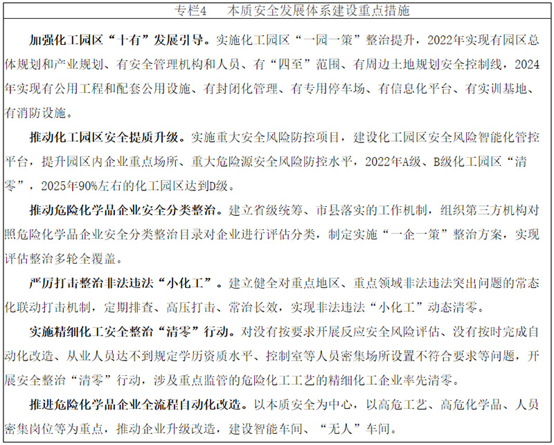 ——加大投入,本質(zhì)安全。堅持安全第一,把本質(zhì)安全提升作為核心任務(wù),突出化工園區(qū)安全提質(zhì)、大型油氣儲存基地安全防控、企業(yè)安全改造、從業(yè)人員培訓(xùn)、“工業(yè)互聯(lián)網(wǎng)+危化安全生產(chǎn)”等重點方向,實施一批本質(zhì)安全提升工程。