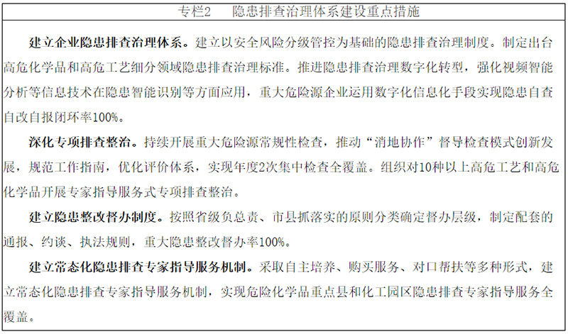 ——安全治理體系建設(shè)明顯提速。地方黨政領(lǐng)導(dǎo)責(zé)任、部門監(jiān)管責(zé)任、企業(yè)主體責(zé)任得到有效落實,重大危險源管控機(jī)制穩(wěn)定運(yùn)行,企業(yè)安全風(fēng)險分級管控和隱患排查治理機(jī)制(以下簡稱雙重預(yù)防機(jī)制)數(shù)字化建設(shè)全面突破;化工園區(qū)、危險化學(xué)品企業(yè)安全整治成效明顯;法規(guī)標(biāo)準(zhǔn)體系更加完善,從業(yè)人員素質(zhì)、科技創(chuàng)新能力、社會服務(wù)水平、應(yīng)急救援能力顯著提升,基礎(chǔ)支撐保障更加有力。