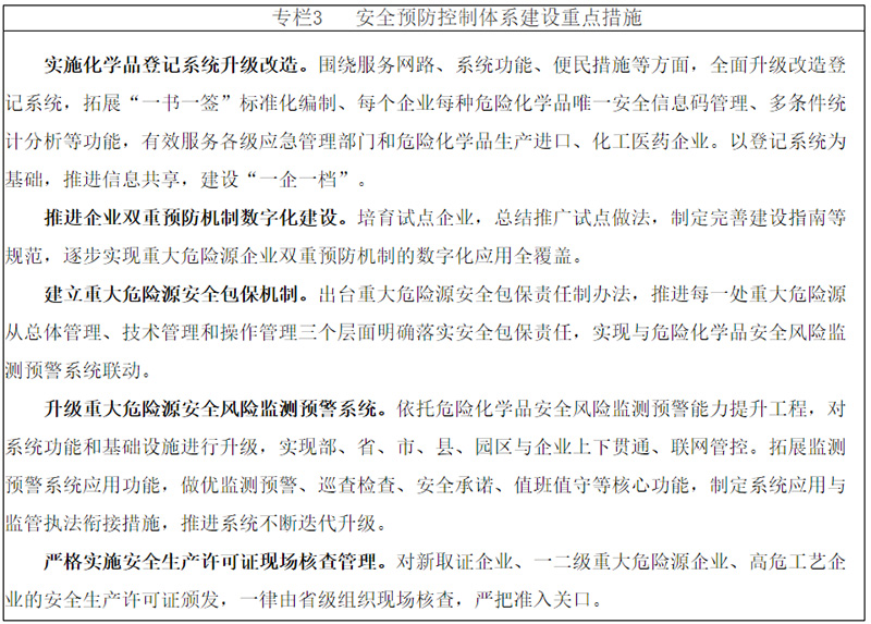 堅持關(guān)口前移、源頭防范,完善落實基礎(chǔ)制度,突出重大安全風(fēng)險管控,全面提升化學(xué)品風(fēng)險辨識、重大危險源精準(zhǔn)監(jiān)管、高風(fēng)險分級管控和企業(yè)安全管理水平,構(gòu)建制度完備、執(zhí)行有力、平臺支撐、精準(zhǔn)有效的安全預(yù)防控制體系。