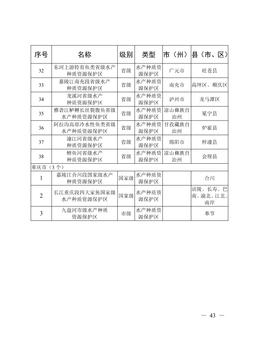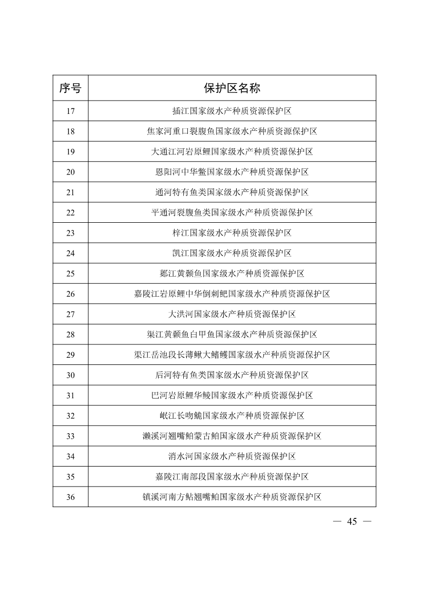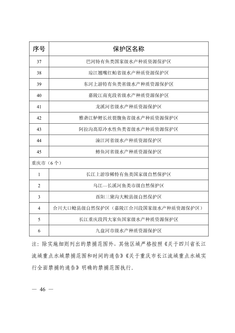 第十七條 禁止在長江、大渡河、岷江、赤水河、沱江、嘉陵江、烏江、漢江和 51 個(gè)(四川省 45 個(gè)、重慶市 6 個(gè))水生生物保護(hù)區(qū)開展生產(chǎn)性捕撈。