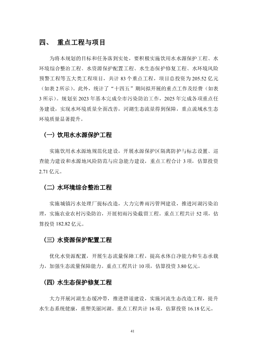 為將本規(guī)劃的目標(biāo)和任務(wù)落到實處,要積極實施飲用水水源保護(hù)工程、水環(huán)境綜合整治工程、水資源保護(hù)配置工程、水生態(tài)保護(hù)修復(fù)工程、水環(huán)境風(fēng)險預(yù)警工程等五大類工程項目,共計 83 個重點工程,項目總投資為 205.52 億元。