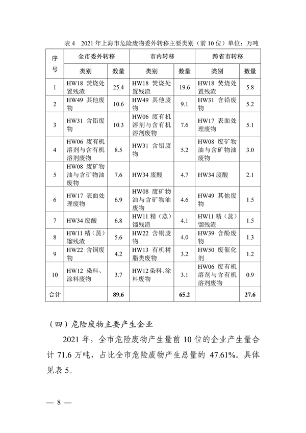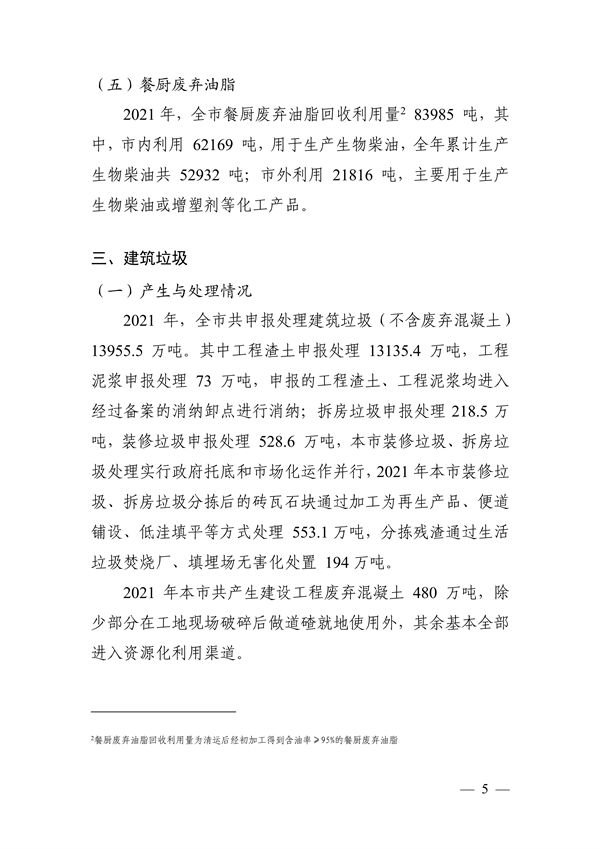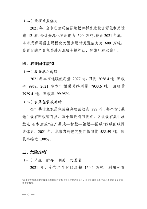 根據(jù)《中華人民共和國固體廢物污染環(huán)境防治法》第二十九條“生態(tài)環(huán)境主管部門應(yīng)當(dāng)會(huì)同住房城鄉(xiāng)建設(shè)、農(nóng)業(yè)農(nóng)村、衛(wèi)生健康等主管部門,定期向社會(huì)發(fā)布固體廢物的種類、產(chǎn)生量、處置能力、利用處置狀況等信息”的規(guī)定,按照原國家環(huán)境保護(hù)總局頒布的《大中城市固體廢物污染環(huán)境防治信息發(fā)布導(dǎo)則》的要求,上海市生態(tài)環(huán)境局發(fā)布《2021 年上海市固體廢物污染環(huán)境防治信息公告》,其中包含一般工業(yè)固廢、生活垃圾、建筑垃圾、農(nóng)業(yè)固體廢物、危險(xiǎn)廢物等產(chǎn)生、貯存、利用、處置量和利用處置情況。