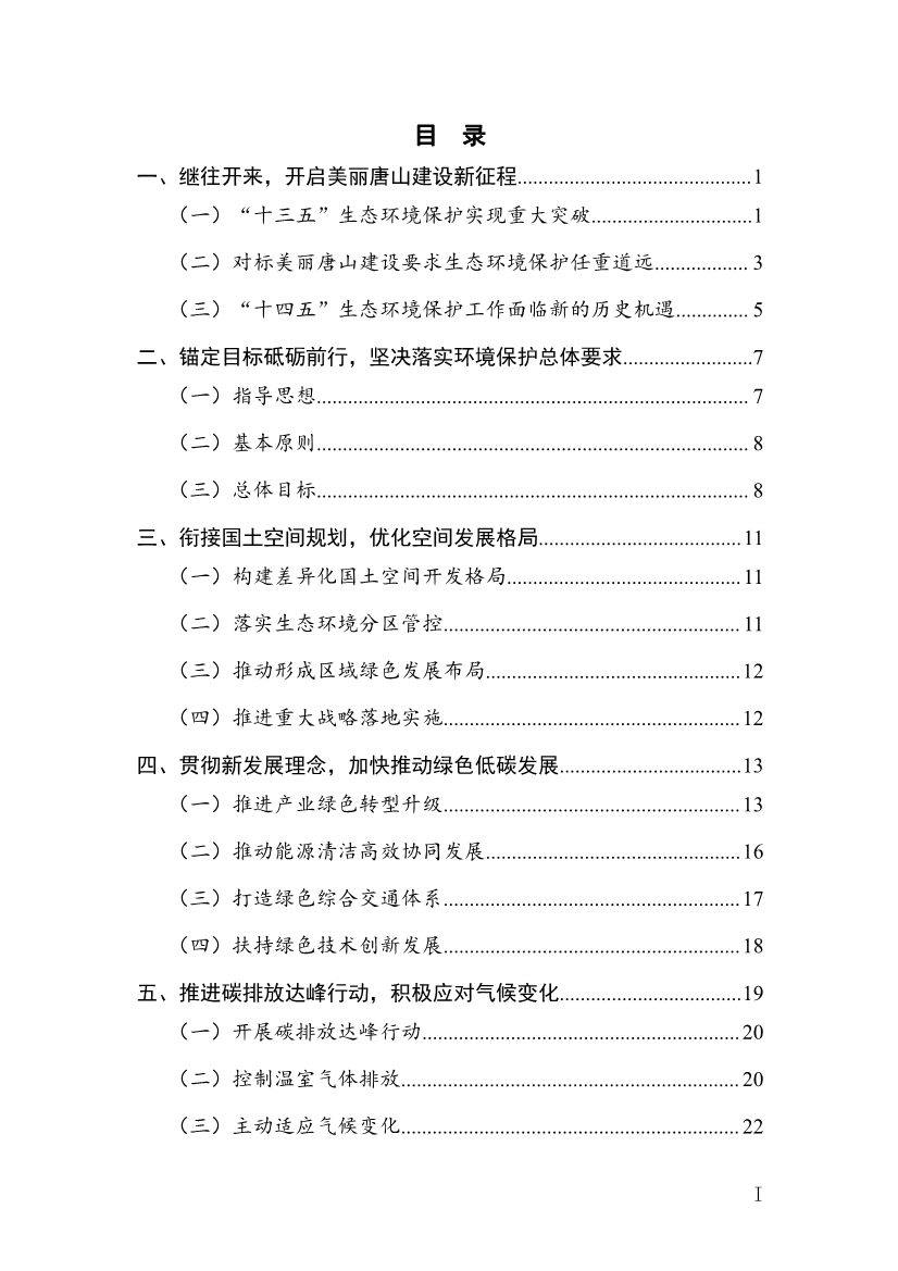 第一部分,基礎(chǔ)形勢(shì),包括“十三五”生態(tài)環(huán)境保護(hù)實(shí)現(xiàn)重大突破、對(duì)標(biāo)美麗唐山建設(shè)要求生態(tài)環(huán)境保護(hù)任重道遠(yuǎn)和“十四五”生態(tài)環(huán)境保護(hù)工作面臨新的歷史機(jī)遇。《唐山市生態(tài)環(huán)境保護(hù)”十四五“規(guī)劃》