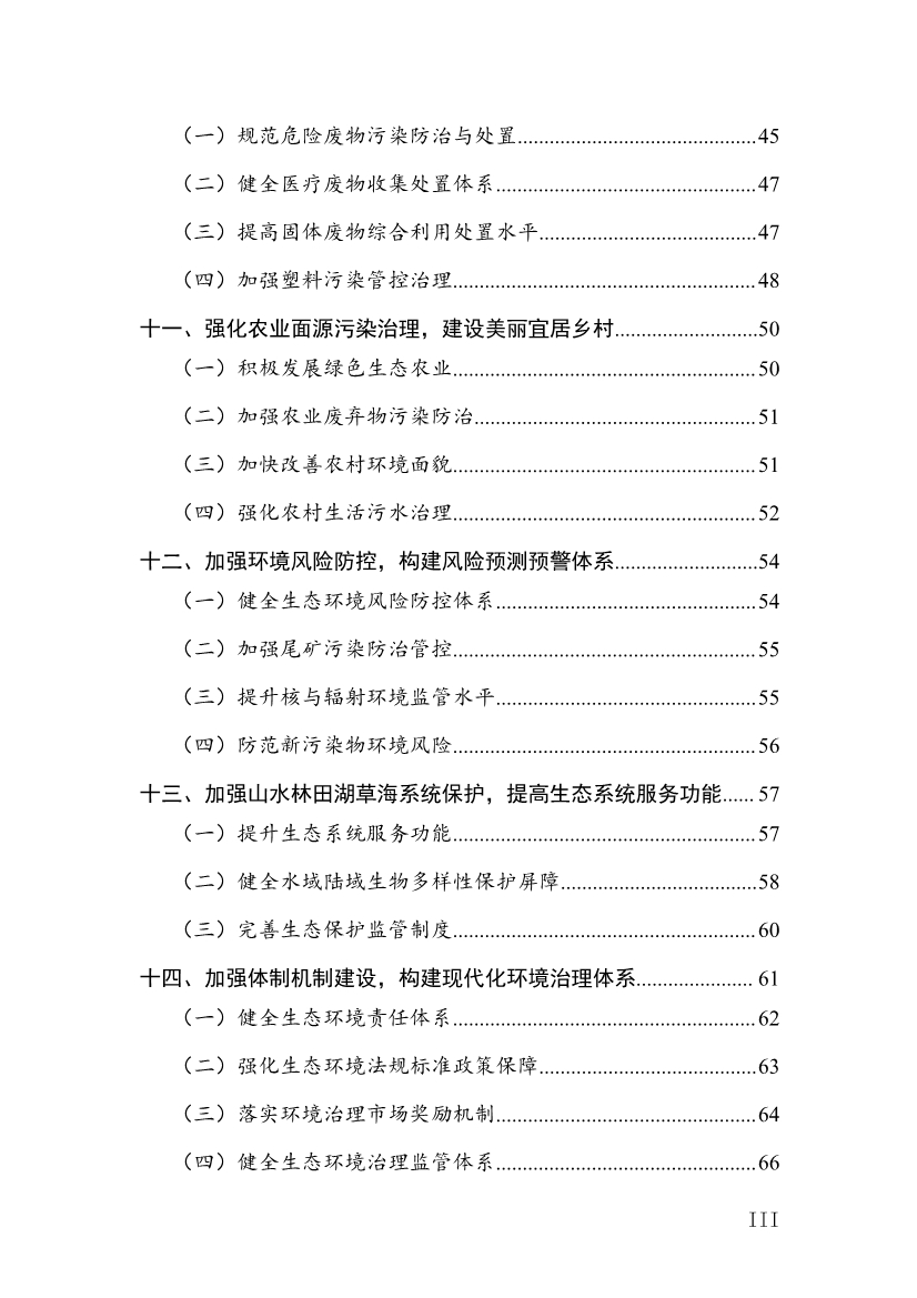 第三部分,主要任務(wù),包括優(yōu)化空間發(fā)展格局、加快推動(dòng)綠色低碳發(fā)展、積極應(yīng)對(duì)氣候變化、持續(xù)改善環(huán)境空氣質(zhì)量、推進(jìn)水生態(tài)環(huán)境改善、推進(jìn)“美麗海灣”建設(shè)、保障土壤地下水環(huán)境安全、穩(wěn)步推進(jìn)“無(wú)廢城市”建設(shè)、建設(shè)美麗宜居鄉(xiāng)村、構(gòu)建風(fēng)險(xiǎn)預(yù)測(cè)預(yù)警體系、提高生態(tài)系統(tǒng)服務(wù)功能、構(gòu)建現(xiàn)代化環(huán)境治理體系、營(yíng)造綠色低碳生活新時(shí)尚。工程咨詢_規(guī)劃綱要_縣域經(jīng)濟(jì)