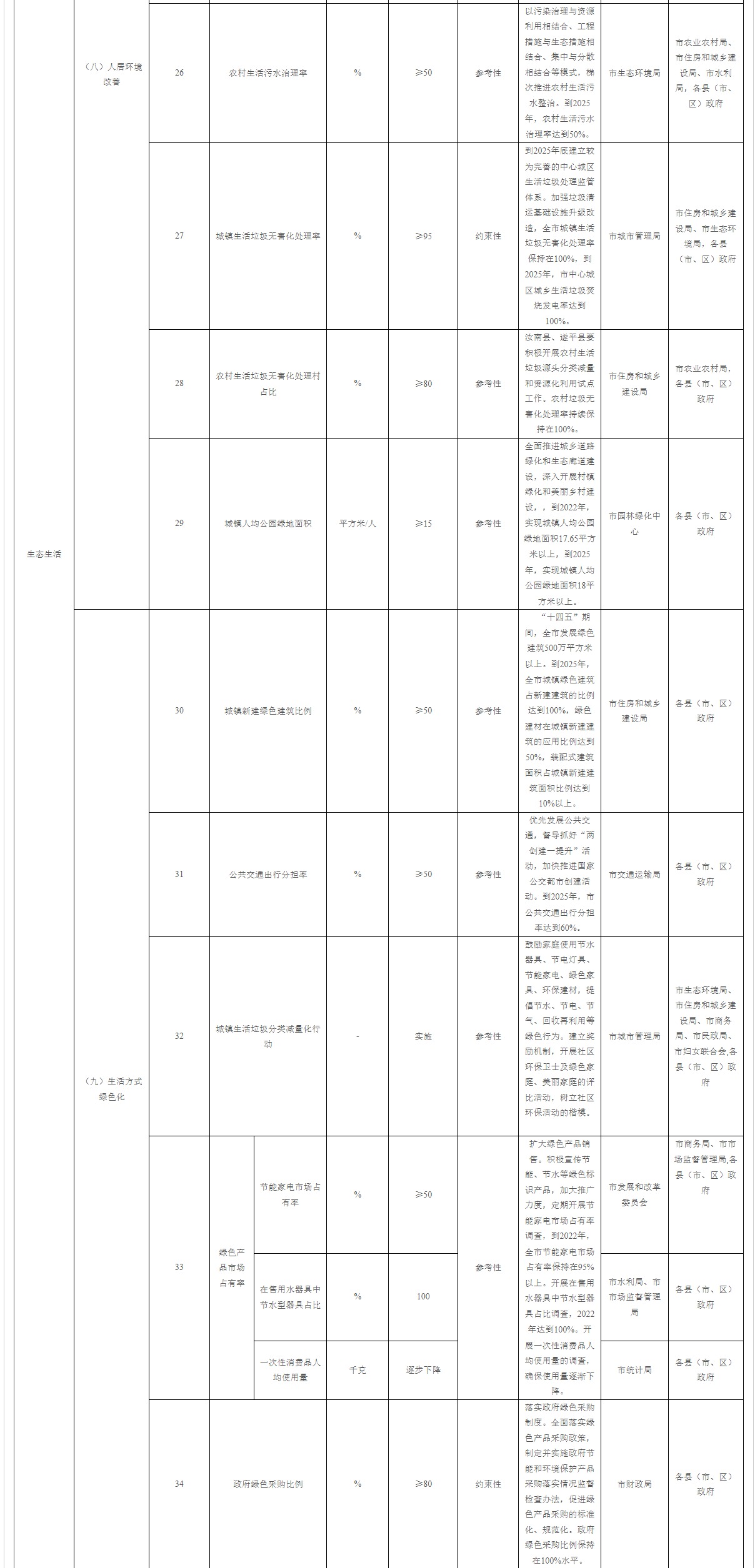 17.市住房和城鄉(xiāng)建設(shè)局:持續(xù)開展“千萬工程”示范創(chuàng)建,加強農(nóng)村人居環(huán)境綜合整治;完善城鎮(zhèn)污水收集處理體系,持續(xù)推進城鎮(zhèn)生活垃圾分類減量化和無害化行動;鞏固提升農(nóng)村生活垃圾綜合治理水平;“十四五”期間,全市發(fā)展綠色建筑500萬平方米以上;建立健全社區(qū)人居環(huán)境建設(shè)和整治機制,完善生態(tài)基礎(chǔ)設(shè)施建設(shè);負責(zé)編制本部門所承擔的生態(tài)文明建設(shè)示范市創(chuàng)建指標完成情況年度評估報告。