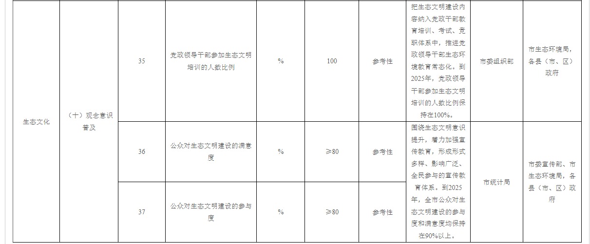 35.廣泛開展生態(tài)文明宣傳教育。圍繞生態(tài)文明意識提升,著力加強宣傳教育,形成形式多樣、影響廣泛、全民參與的宣傳教育體系。到2025年,全市公眾對生態(tài)文明建設(shè)的參與度和滿意度均保持在90%以上。(市委宣傳部牽頭,市統(tǒng)計局、市生態(tài)環(huán)境局參與)