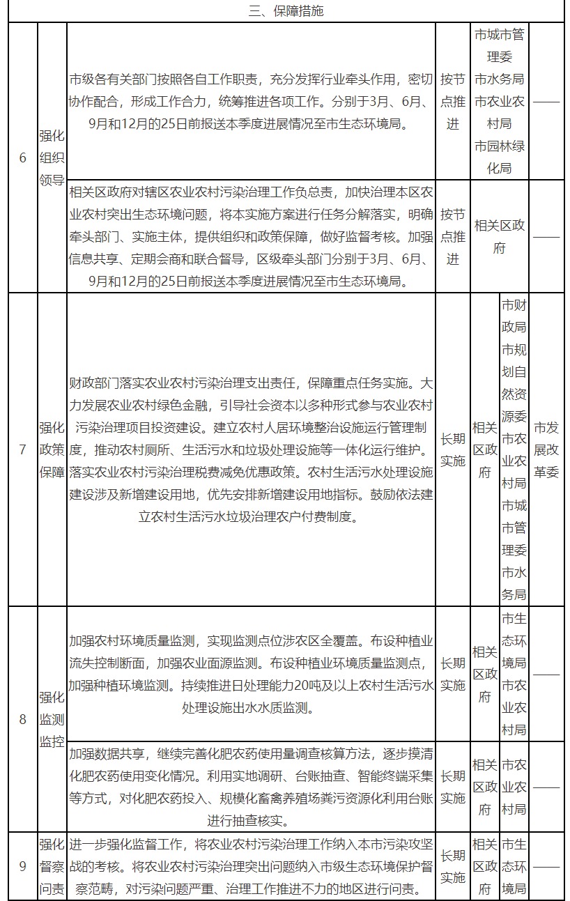 三是做好保障,強(qiáng)化監(jiān)督。各區(qū)、各部門要注重政策集成,落實(shí)國(guó)家和本市各項(xiàng)優(yōu)惠政策和補(bǔ)貼政策,加強(qiáng)農(nóng)業(yè)農(nóng)村污染治理相關(guān)項(xiàng)目?jī)?chǔ)備。要充分利用好督察、考核手段,將重點(diǎn)任務(wù)落實(shí)情況納入生態(tài)環(huán)境保護(hù)督察、績(jī)效管理范疇,對(duì)責(zé)任不落實(shí)、工作不到位、生態(tài)環(huán)境問(wèn)題突出的,嚴(yán)格依紀(jì)依規(guī)追究責(zé)任。加強(qiáng)農(nóng)村生態(tài)環(huán)境宣傳教育,提高村民生態(tài)文明意識(shí),主動(dòng)接受社會(huì)監(jiān)督。