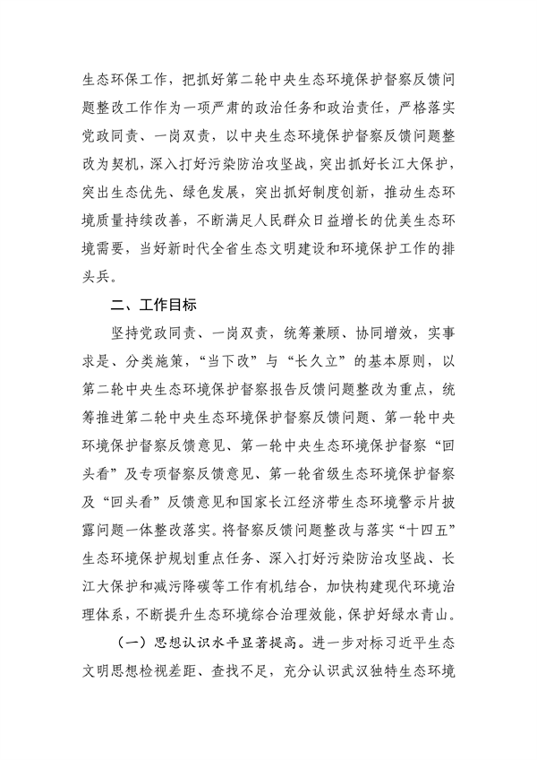 《整改方案》明確要求,全面貫徹黨的十九大和十九屆歷次全會精神,深入貫徹習(xí)近平生態(tài)文明思想和習(xí)近平總書記對武漢工作的重要指示要求,完整、準(zhǔn)確、全面貫徹新發(fā)展理念,以中央生態(tài)環(huán)境保護(hù)督察反饋問題整改為契機(jī),深入打好污染防治攻堅(jiān)戰(zhàn),突出抓好長江大保護(hù),突出抓好制度創(chuàng)新,推動生態(tài)環(huán)境質(zhì)量持續(xù)改善,切實(shí)在生態(tài)優(yōu)先、綠色發(fā)展方面發(fā)揮“一主引領(lǐng)”作用,弘揚(yáng)偉大抗疫精神,當(dāng)好新時代全省生態(tài)文明建設(shè)和環(huán)境保護(hù)工作的排頭兵。