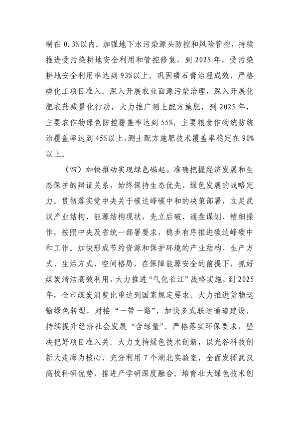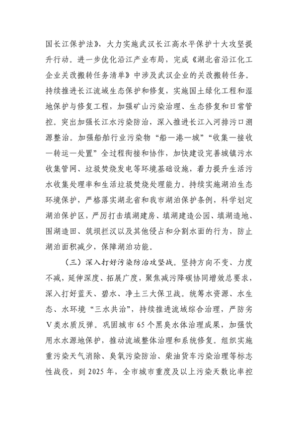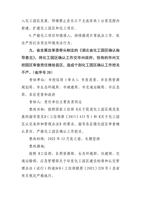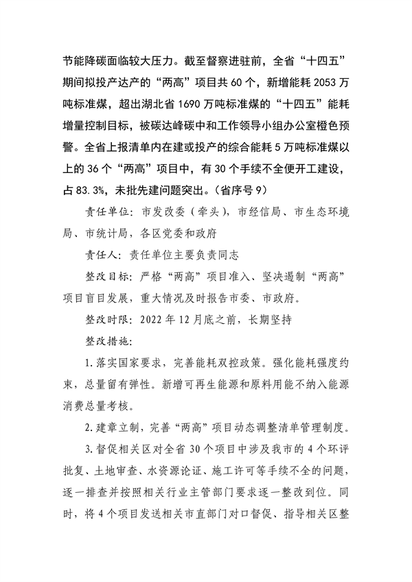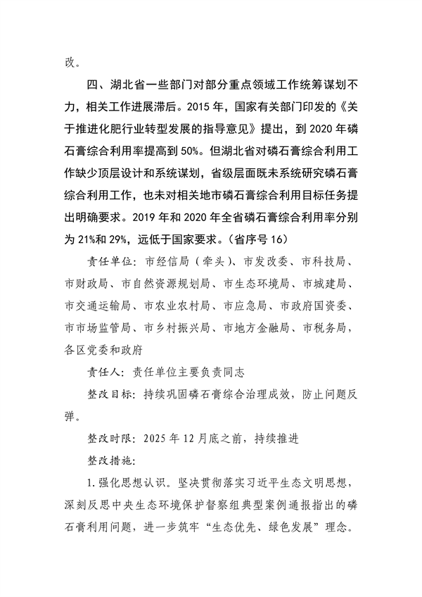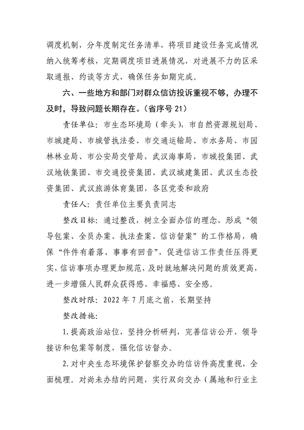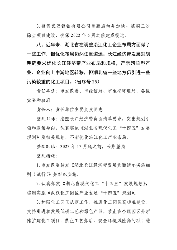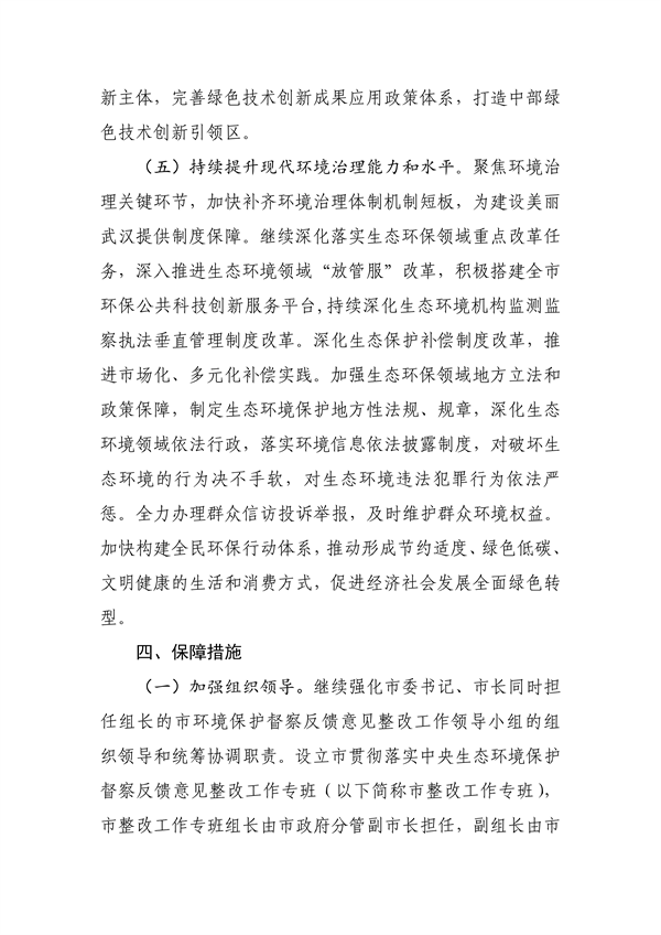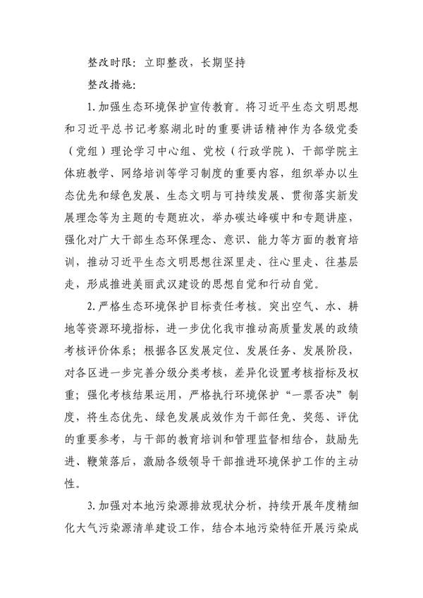 《整改方案》列出了整改措施清單。對每個問題逐一明確責(zé)任領(lǐng)導(dǎo)、責(zé)任單位、責(zé)任人、整改目標(biāo)、整改時限、整改措施,實(shí)行清單化管理。在堅(jiān)決完成督察整改任務(wù)的同時,舉一反三,制定了5個方面的強(qiáng)化措施。一是深入踐行習(xí)近平生態(tài)文明思想。把學(xué)習(xí)貫徹習(xí)近平生態(tài)文明思想和習(xí)近平總書記重要指示批示精神作為全市各級黨委和政府重要政治任務(wù),做到系統(tǒng)學(xué)習(xí)、全面把握和深刻領(lǐng)悟,不斷增強(qiáng)思想自覺、政治自覺和行動自覺。深入貫徹綠水青山就是金山銀山的理念,堅(jiān)持生態(tài)優(yōu)先,綠色發(fā)展,深化生態(tài)市建設(shè),堅(jiān)決走符合武漢實(shí)際的可持續(xù)發(fā)展之路。全面夯實(shí)生態(tài)環(huán)境保護(hù)“黨政同責(zé)、一崗雙責(zé)”,健全完善生態(tài)文明建設(shè)目標(biāo)責(zé)任評價考核體系。二是堅(jiān)定不移共抓長江大保護(hù)。堅(jiān)決把修復(fù)好、保護(hù)好長江生態(tài)環(huán)境擺在壓倒性位置。嚴(yán)格落實(shí)《中華人民共和國長江保護(hù)法》,大力實(shí)施武漢長江高水平保護(hù)十大攻堅(jiān)提升行動,持續(xù)推進(jìn)長江流域生態(tài)保護(hù)和修復(fù),切實(shí)加強(qiáng)礦山污染治理、生態(tài)修復(fù)和日常管控。突出加強(qiáng)長江水污染防治,深入推進(jìn)長江入河排污口溯源整治,加快建設(shè)完善環(huán)境基礎(chǔ)設(shè)施,持續(xù)實(shí)施湖泊生態(tài)環(huán)境保護(hù),保障湖泊功能。三是深入打好污染防治攻堅(jiān)戰(zhàn)。堅(jiān)持方向不變、力度不減,延伸深度、拓展廣度,深入打好藍(lán)天、碧水、凈土三大保衛(wèi)戰(zhàn)。統(tǒng)籌水資源、水生態(tài)、水環(huán)境“三水共治”。組織實(shí)施重污染天氣消除等標(biāo)志性戰(zhàn)役,到2025年,全市重度及以上污染天數(shù)比率控制在0.3%以內(nèi)。加強(qiáng)地下水污染源頭防控和風(fēng)險管控,深入開展農(nóng)業(yè)面源污染治理。四是加快推動實(shí)現(xiàn)綠色崛起。貫徹落實(shí)黨中央關(guān)于碳達(dá)峰碳中和的決策部署,先立后破、通盤謀劃、精細(xì)操作,穩(wěn)步有序推進(jìn)碳達(dá)峰碳中和工作,加快形成節(jié)約資源和保護(hù)環(huán)境的產(chǎn)業(yè)結(jié)構(gòu)、生產(chǎn)方式、生活方式、空間格局。大力支持綠色技術(shù)創(chuàng)新,全面發(fā)揮武漢高??蒲袃?yōu)勢,推進(jìn)產(chǎn)學(xué)研深度融合。培育壯大綠色技術(shù)創(chuàng)新主體,打造中部綠色技術(shù)創(chuàng)新引領(lǐng)區(qū)。五是持續(xù)提升現(xiàn)代環(huán)境治理能力和水平。深入推進(jìn)生態(tài)環(huán)境領(lǐng)域“放管服”改革,深化生態(tài)保護(hù)補(bǔ)償制度改革,推進(jìn)市場化、多元化補(bǔ)償實(shí)踐。加強(qiáng)生態(tài)環(huán)保領(lǐng)域地方立法和政策保障,深化生態(tài)環(huán)境領(lǐng)域依法行政,對破壞生態(tài)環(huán)境的行為決不手軟,對生態(tài)環(huán)境違法犯罪行為依法嚴(yán)懲。加快構(gòu)建全民環(huán)保行動體系,推動形成節(jié)約適度、綠色低碳、文明健康的生活和消費(fèi)方式,促進(jìn)經(jīng)濟(jì)社會發(fā)展全面綠色轉(zhuǎn)型。