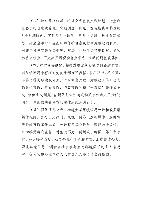 為保障整改工作順利開展,《整改方案》明確了5個方面組織保障措施。一是強(qiáng)化組織領(lǐng)導(dǎo)。市環(huán)境保護(hù)督察工作領(lǐng)導(dǎo)小組統(tǒng)籌推進(jìn)中央生態(tài)環(huán)境保護(hù)督察反饋問題整改。設(shè)立市貫徹落實(shí)中央生態(tài)環(huán)境保護(hù)督察反饋意見整改工作專班,協(xié)調(diào)各區(qū)、市級有關(guān)部門和單位推進(jìn)督察反饋問題整改工作。對涉及全局性、系統(tǒng)性、跨流域跨區(qū)域的生態(tài)環(huán)境問題,明確牽頭單位。每一項(xiàng)整改任務(wù)由相關(guān)市領(lǐng)導(dǎo)作為責(zé)任領(lǐng)導(dǎo),強(qiáng)化統(tǒng)籌引領(lǐng)和督查督辦。二是嚴(yán)格整改責(zé)任。承擔(dān)督察反饋問題整改任務(wù)的各區(qū)黨委和政府、市級有關(guān)部門和單位是整改工作的責(zé)任主體,其主要負(fù)責(zé)人對本地、本部門和單位的整改工作負(fù)總責(zé)。各區(qū)、市級有關(guān)部門和單位應(yīng)制定完善本地、本部門和單位的具體整改工作方案,進(jìn)一步細(xì)化分解責(zé)任,每項(xiàng)整改任務(wù)均應(yīng)明確一名領(lǐng)導(dǎo)班子成員為第一責(zé)任人,并確定具體責(zé)任人,確保責(zé)任壓實(shí)到位。三是健全整改機(jī)制。根據(jù)全省整改交賬計劃,對整改任務(wù)實(shí)行臺賬式管理,定期調(diào)度、交賬。其中在近期集中整改的6個月期限內(nèi),實(shí)行每月一調(diào)度,雙月一交賬。建立督察整改完成情況驗(yàn)收制度,對整改任務(wù)實(shí)施動態(tài)管理,推動整改落實(shí)。四是嚴(yán)肅責(zé)任追究。加強(qiáng)對整改落實(shí)的跟進(jìn)監(jiān)督,對整改工作中出現(xiàn)的敷衍整改、表面整改、假裝整改和搞“一刀切”等形式主義、官僚主義問題,依規(guī)依紀(jì)依法追究相關(guān)單位和人員責(zé)任。五是強(qiáng)化信息公開。充分運(yùn)用報刊、電視、網(wǎng)絡(luò)以及新媒體,及時宣傳報道整改工作成效、公開整改工作進(jìn)展、曝光典型案例問責(zé)情況,回應(yīng)社會關(guān)切,主動接受群眾監(jiān)督。強(qiáng)化輿論引導(dǎo),調(diào)動全社會參與生態(tài)環(huán)境保護(hù)的主人翁意識,努力營造環(huán)境保護(hù)人人有責(zé)的良好氛圍。