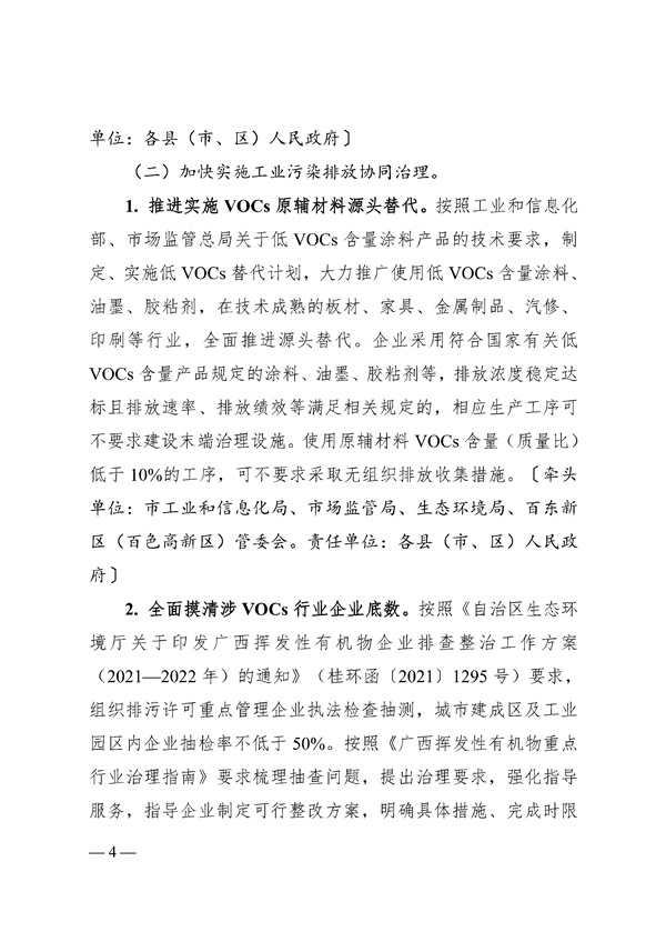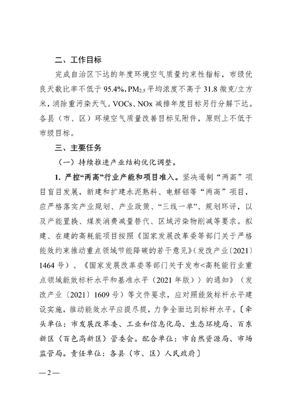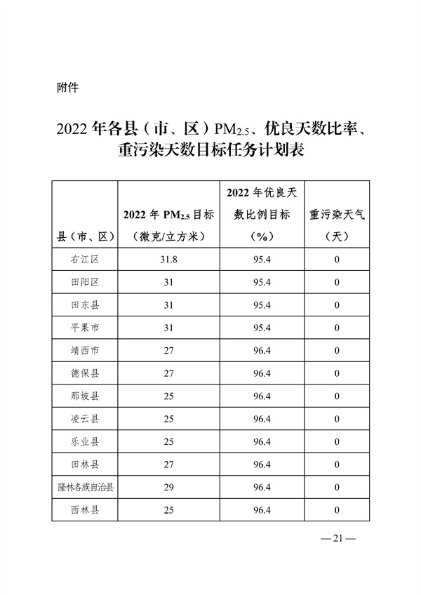日前,百色市印發(fā)2022年度大氣污染防治工作計劃,指出工作目標為完成自治區(qū)下達的年度環(huán)境空氣質量約束性指標,市級優(yōu)良天數(shù)比率不低于 95.4%,PM2.5 平均濃度不高于 31.8 微克/立方 米,消除重污染天氣。VOCs、NOx 減排年度目標另行分解下達。 各縣(市、區(qū))環(huán)境空氣質量改善目標見附件,原則上不低于市級目標。詳情如下:
