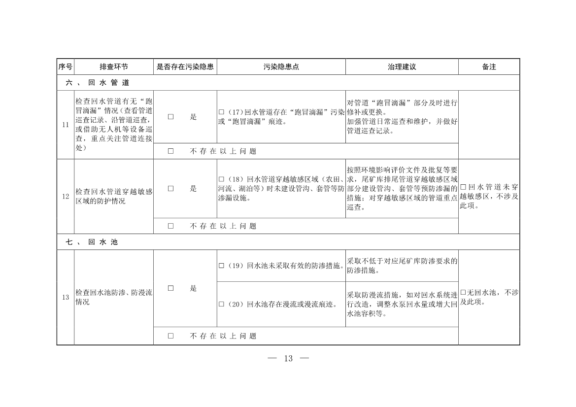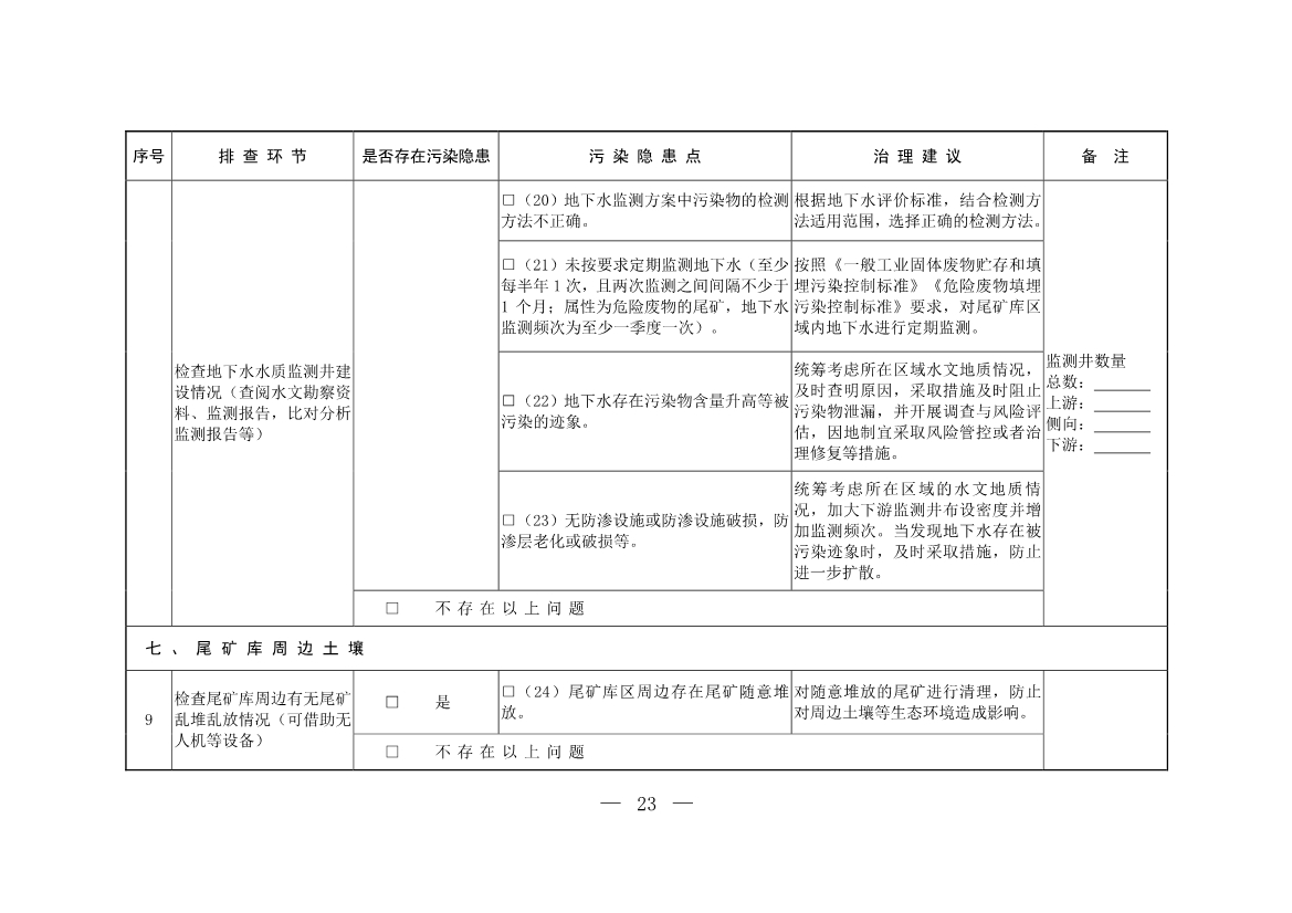 尾礦庫運(yùn)營、管理單位要建立健全尾礦庫污染隱患排查治理制度,強(qiáng)化日常排查治理工作,并在每年汛期前至少開展一次全面排查治理。根據(jù)排查問題清單,結(jié)合日常排查治理情況,制定治理方案,實(shí)施“一庫一策”治理,明確具體治理措施、完成時(shí)間以及后續(xù)管理措施,消除污染隱患。同時(shí)按照排查治理內(nèi)容及變化情況及時(shí)更新尾礦庫環(huán)境管理臺(tái)賬。