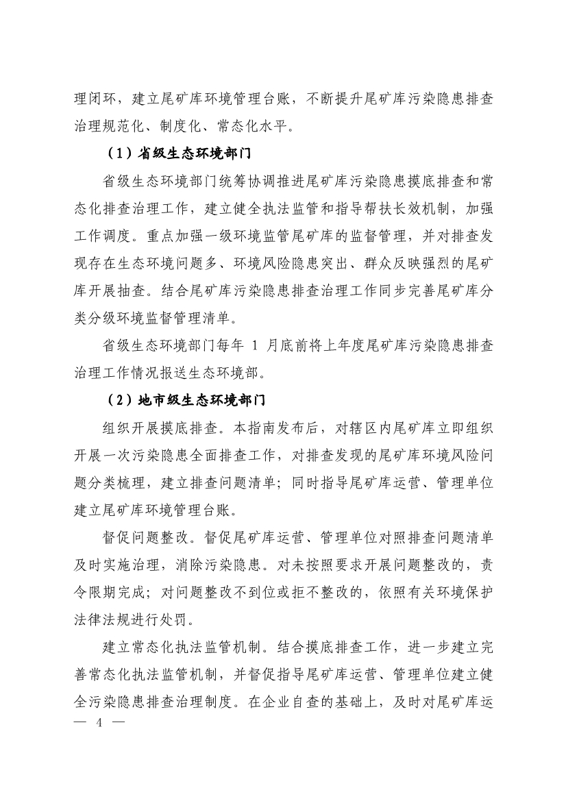省級生態(tài)環(huán)境部門統(tǒng)籌協(xié)調(diào)推進(jìn)尾礦庫污染隱患摸底排查和常態(tài)化排查治理工作,建立健全執(zhí)法監(jiān)管和指導(dǎo)幫扶長效機(jī)制,重點(diǎn)加強(qiáng)一級環(huán)境監(jiān)管尾礦庫的監(jiān)督管理,同步完善尾礦庫分類分級環(huán)境監(jiān)督管理清單。