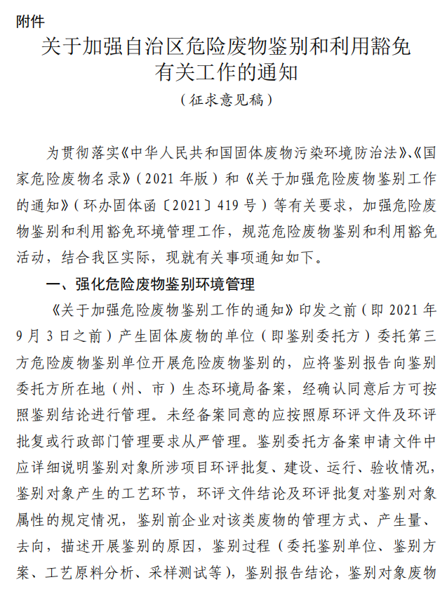 《關(guān)于<加強(qiáng)新疆維吾爾自治區(qū)危險(xiǎn)廢物鑒別和利用豁免有關(guān)工作>的通知》(征求意見(jiàn)稿)