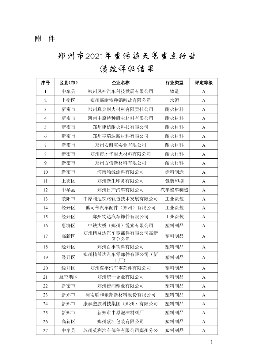 《鄭州市2021年重污染天氣重點行業(yè)績效評級結(jié)果》