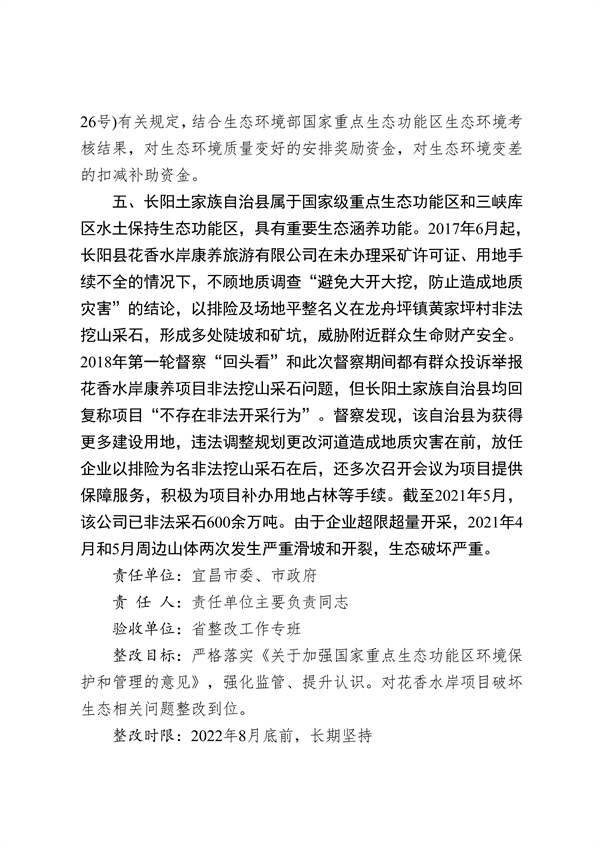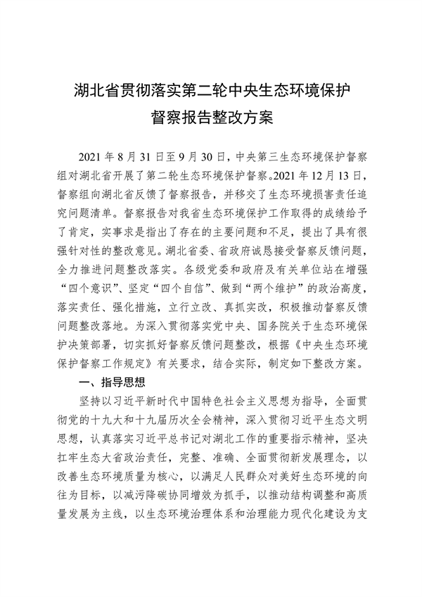 2021年8月31日至9月30日,中央第三生態(tài)環(huán)境保護(hù)督察組對湖北省開展了第二輪生態(tài)環(huán)境保護(hù)督察,并于12月13日反饋了督察報(bào)告。湖北省委、省政府高度重視中央生態(tài)環(huán)境保護(hù)督察整改工作。針對督察報(bào)告指出的問題,湖北省及時(shí)研究制定上報(bào)了《湖北省貫徹落實(shí)第二輪中央生態(tài)環(huán)境保護(hù)督察報(bào)告整改方案》(以下簡稱《整改方案》)。目前,《整改方案》已經(jīng)黨中央、國務(wù)院批準(zhǔn),現(xiàn)按要求予以公開。