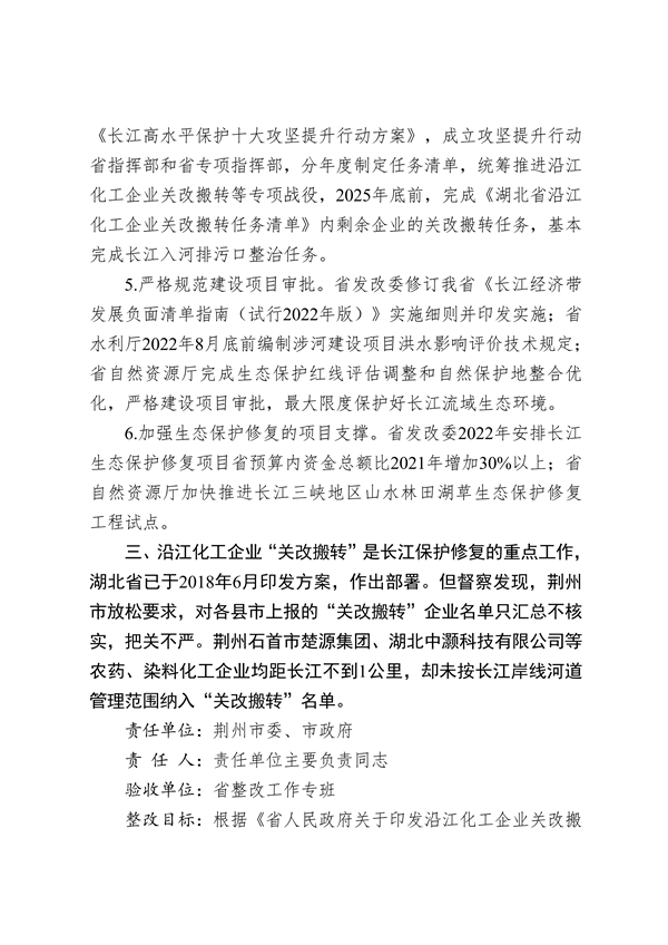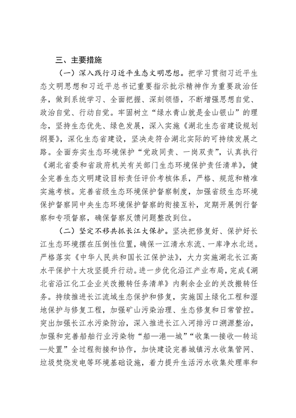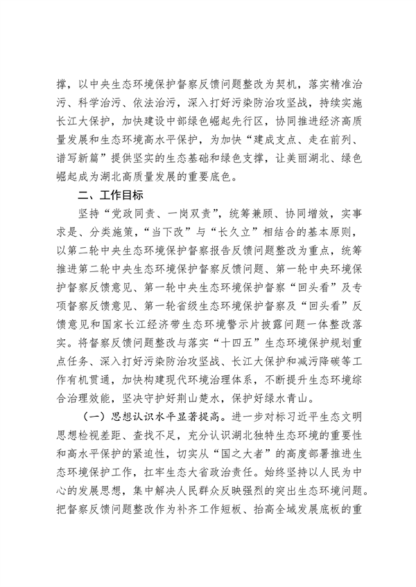 《整改方案》明確要求,全面貫徹黨的十九大和十九屆歷次全會(huì)精神,深入貫徹習(xí)近平生態(tài)文明思想和習(xí)近平總書記對湖北工作的重要指示精神,完整、準(zhǔn)確、全面貫徹新發(fā)展理念,以中央生態(tài)環(huán)境保護(hù)督察反饋問題整改為契機(jī),深入打好污染防治攻堅(jiān)戰(zhàn),持續(xù)實(shí)施長江大保護(hù),加快建設(shè)中部綠色崛起先行區(qū),協(xié)同推進(jìn)經(jīng)濟(jì)高質(zhì)量發(fā)展和生態(tài)環(huán)境高水平保護(hù),為湖北加快“建成支點(diǎn)、走在前列、譜寫新篇”提供堅(jiān)實(shí)的生態(tài)基礎(chǔ)和綠色支撐。