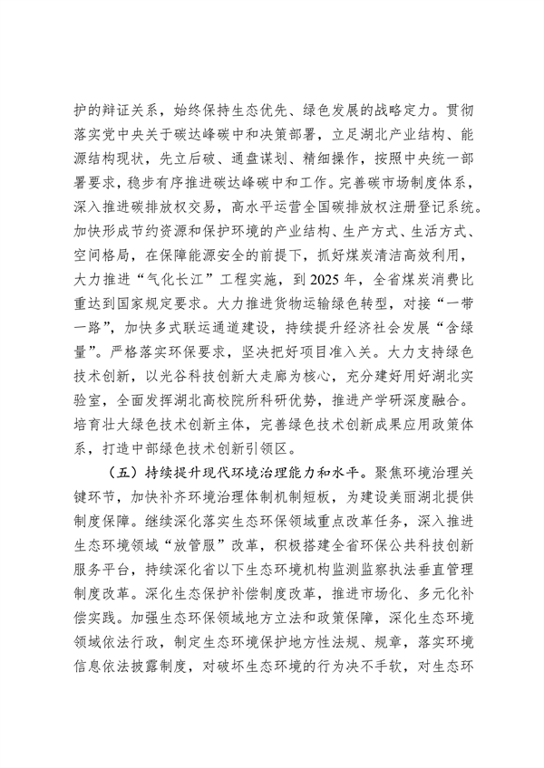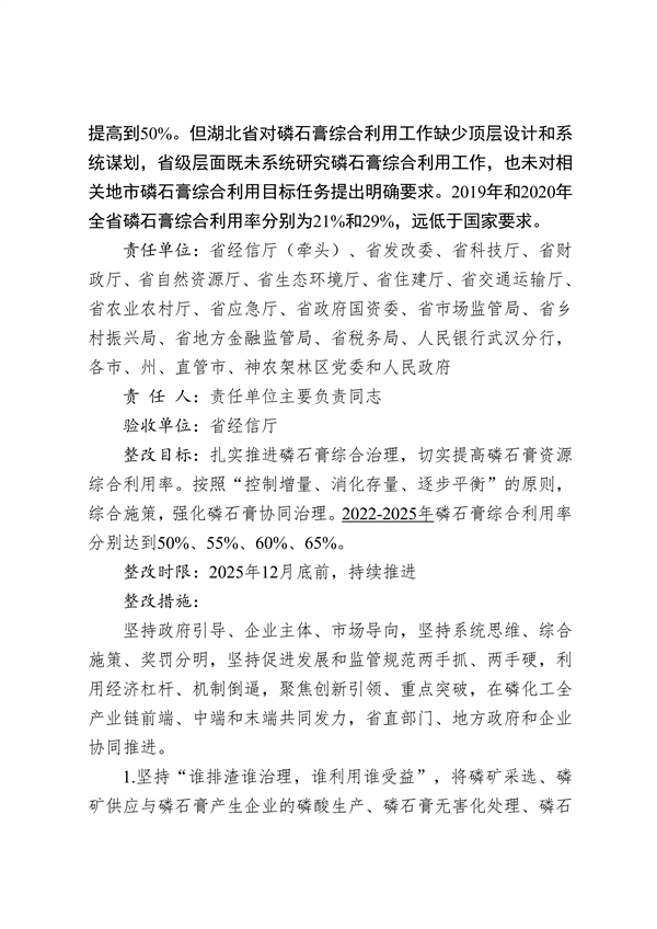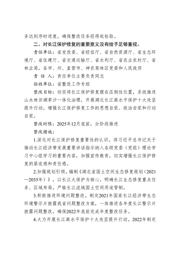 《整改方案》列出了整改措施清單。對每項(xiàng)整改任務(wù)逐一明確責(zé)任單位、責(zé)任人、驗(yàn)收單位、整改目標(biāo)、整改時(shí)限、整改措施,實(shí)行清單化管理。在堅(jiān)決完成督察整改任務(wù)的同時(shí),舉一反三,制定了5個(gè)方面的強(qiáng)化措施。一是深入踐行習(xí)近平生態(tài)文明思想。把學(xué)習(xí)貫徹習(xí)近平生態(tài)文明思想和習(xí)近平總書記重要指示批示精神作為重要政治任務(wù),做到系統(tǒng)學(xué)習(xí)、全面把握、深刻領(lǐng)悟,不斷增強(qiáng)思想自覺、政治自覺和行動(dòng)自覺。深入貫徹“綠水青山就是金山銀山”的理念,堅(jiān)持生態(tài)優(yōu)先、綠色發(fā)展,深化生態(tài)省建設(shè),堅(jiān)決走符合湖北實(shí)際的可持續(xù)發(fā)展之路。全面夯實(shí)生態(tài)環(huán)境保護(hù)“黨政同責(zé)、一崗雙責(zé)”,健全完善生態(tài)文明建設(shè)目標(biāo)責(zé)任評價(jià)考核體系。二是堅(jiān)定不移共抓長江大保護(hù)。堅(jiān)決把修復(fù)好、保護(hù)好長江生態(tài)環(huán)境擺在壓倒性位置,確保一江清水東流、一庫凈水北送。嚴(yán)格落實(shí)《中華人民共和國長江保護(hù)法》,大力實(shí)施湖北長江高水平保護(hù)十大攻堅(jiān)提升行動(dòng),持續(xù)推進(jìn)長江流域生態(tài)保護(hù)和修復(fù),切實(shí)加強(qiáng)礦山污染治理、生態(tài)修復(fù)和日常管控。突出加強(qiáng)長江水污染防治,深入推進(jìn)長江入河排污口溯源整治,加快建設(shè)完善環(huán)境基礎(chǔ)設(shè)施,持續(xù)實(shí)施湖泊生態(tài)環(huán)境保護(hù),保障湖泊功能。三是深入打好污染防治攻堅(jiān)戰(zhàn)。堅(jiān)持方向不變、力度不減,延伸深度、拓展廣度,深入打好藍(lán)天、碧水、凈土三大保衛(wèi)戰(zhàn)。統(tǒng)籌水資源、水生態(tài)、水環(huán)境“三水共治”,持續(xù)推進(jìn)四湖總干渠、竹皮河、浰河、神定河、泗河流域綜合治理。組織實(shí)施重污染天氣消除等標(biāo)志性戰(zhàn)役,到2025年,全省地級及以上城市重度及以上污染天數(shù)比率均值控制在0.6%以內(nèi)。加強(qiáng)地下水污染源頭防控和風(fēng)險(xiǎn)管控,深入開展農(nóng)業(yè)面源污染治理。四是加快推動(dòng)實(shí)現(xiàn)綠色崛起。貫徹落實(shí)黨中央關(guān)于碳達(dá)峰碳中和決策部署,先立后破、通盤謀劃、精細(xì)操作,高水平運(yùn)營全國碳排放權(quán)注冊登記系統(tǒng),穩(wěn)步有序推進(jìn)碳達(dá)峰碳中和工作,加快形成節(jié)約資源和保護(hù)環(huán)境的產(chǎn)業(yè)結(jié)構(gòu)、生產(chǎn)方式、生活方式、空間格局。大力支持綠色技術(shù)創(chuàng)新,全面發(fā)揮湖北高校院所科研優(yōu)勢,推進(jìn)產(chǎn)學(xué)研深度融合。培育壯大綠色技術(shù)創(chuàng)新主體,打造中部綠色技術(shù)創(chuàng)新引領(lǐng)區(qū)。五是持續(xù)提升現(xiàn)代環(huán)境治理能力和水平。深入推進(jìn)生態(tài)環(huán)境領(lǐng)域“放管服”改革,深化生態(tài)保護(hù)補(bǔ)償制度改革,推進(jìn)市場化、多元化補(bǔ)償實(shí)踐。加強(qiáng)生態(tài)環(huán)保領(lǐng)域地方立法和政策保障,深化生態(tài)環(huán)境領(lǐng)域依法行政,對破壞生態(tài)環(huán)境的行為決不手軟,對生態(tài)環(huán)境違法犯罪行為依法嚴(yán)懲。加快構(gòu)建全民環(huán)保行動(dòng)體系,推動(dòng)形成節(jié)約適度、綠色低碳、文明健康的生活和消費(fèi)方式,促進(jìn)經(jīng)濟(jì)社會(huì)發(fā)展全面綠色轉(zhuǎn)型。