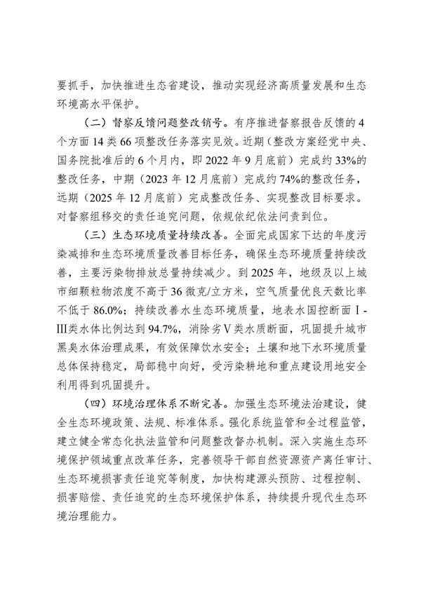 《整改方案》明確了4個(gè)方面的整改工作目標(biāo):一是思想認(rèn)識(shí)水平顯著提高。進(jìn)一步對標(biāo)習(xí)近平生態(tài)文明思想檢視差距、查找不足,切實(shí)從“國之大者”的高度部署推進(jìn)生態(tài)環(huán)境保護(hù)工作,扛牢生態(tài)大省政治責(zé)任。二是督察反饋問題整改銷號(hào)。有序推進(jìn)督察報(bào)告反饋的4個(gè)方面14類66項(xiàng)整改任務(wù)落實(shí)見效。其中,計(jì)劃在2022年9月底前完成22項(xiàng),2022年底前累計(jì)完成39項(xiàng),2023年底前累計(jì)完成49項(xiàng),2025年底前全部完成。三是生態(tài)環(huán)境質(zhì)量持續(xù)改善。到2025年,地級及以上城市細(xì)顆粒物濃度不高于36微克/立方米,空氣質(zhì)量優(yōu)良天數(shù)比率不低于86.0%;持續(xù)改善水生態(tài)環(huán)境質(zhì)量,地表水國控?cái)嗝姊?Ⅲ類水體比例達(dá)到94.7%,消除劣Ⅴ類水質(zhì)斷面,有效保障飲水安全。四是環(huán)境治理體系不斷完善。加強(qiáng)生態(tài)環(huán)境法治建設(shè),健全生態(tài)環(huán)境政策、法規(guī)、標(biāo)準(zhǔn)體系。加快構(gòu)建源頭預(yù)防、過程控制、損害賠償、責(zé)任追究的生態(tài)環(huán)境保護(hù)體系,持續(xù)提升現(xiàn)代生態(tài)環(huán)境治理能力。