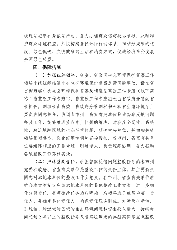 為保障整改工作順利開展,《整改方案》明確了5個(gè)方面的組織保障措施。一是強(qiáng)化組織領(lǐng)導(dǎo)。省委、省政府生態(tài)環(huán)境保護(hù)督察工作領(lǐng)導(dǎo)小組統(tǒng)籌推進(jìn)中央生態(tài)環(huán)境保護(hù)督察反饋問題整改。設(shè)立省貫徹落實(shí)中央生態(tài)環(huán)境保護(hù)督察反饋意見整改工作專班,協(xié)調(diào)各市州、省直有關(guān)單位推進(jìn)督察反饋問題整改工作。對涉及全局性、系統(tǒng)性、跨流域跨區(qū)域的生態(tài)環(huán)境問題,明確牽頭單位,并由相關(guān)省領(lǐng)導(dǎo)領(lǐng)銜督辦,強(qiáng)化統(tǒng)籌協(xié)調(diào)和督導(dǎo)幫扶。二是嚴(yán)格整改責(zé)任。承擔(dān)督察反饋問題整改任務(wù)的各市州黨委和政府、省直有關(guān)單位是整改工作的責(zé)任主體,其主要負(fù)責(zé)同志對本地本單位的整改工作負(fù)總責(zé)。各市州、省直有關(guān)單位應(yīng)制定完善本地本單位的具體整改工作方案,進(jìn)一步細(xì)化分解責(zé)任,每項(xiàng)整改任務(wù)均應(yīng)明確一名領(lǐng)導(dǎo)班子成員為第一責(zé)任人,并確定具體責(zé)任人,確保責(zé)任壓實(shí)到位。三是健全整改機(jī)制。分年度制定全省整改交賬計(jì)劃,對整改任務(wù)實(shí)行臺(tái)賬式管理,定期調(diào)度、交賬和驗(yàn)收。在近期集中整改的6個(gè)月期限內(nèi),實(shí)行每月一調(diào)度、雙月一交賬。建立督察整改完成情況驗(yàn)收制度,對整改任務(wù)實(shí)施動(dòng)態(tài)管理,推動(dòng)整改落實(shí)。四是嚴(yán)肅責(zé)任追究。對中央第三生態(tài)環(huán)境保護(hù)督察組移交的5個(gè)生態(tài)環(huán)境損害責(zé)任追究問題和中央第六生態(tài)環(huán)境保護(hù)督察組曝光的1個(gè)涉及我省生態(tài)環(huán)境損害責(zé)任追究問題,制定問責(zé)工作實(shí)施方案,依規(guī)依紀(jì)依法、嚴(yán)肅精準(zhǔn)有效問責(zé)。加強(qiáng)跟進(jìn)監(jiān)督,對整改工作中出現(xiàn)的敷衍整改、表面整改、假裝整改和搞“一刀切”等形式主義、官僚主義問題,依規(guī)依紀(jì)依法追究相關(guān)單位和人員責(zé)任。五是強(qiáng)化信息公開。充分運(yùn)用報(bào)刊、電視、網(wǎng)絡(luò)以及新媒體,及時(shí)宣傳報(bào)道整改工作成效、公開整改工作進(jìn)展、曝光典型案例問責(zé)情況,回應(yīng)社會(huì)關(guān)切,主動(dòng)接受群眾監(jiān)督。強(qiáng)化輿論引導(dǎo),調(diào)動(dòng)全社會(huì)參與生態(tài)環(huán)境保護(hù)的主人翁意識(shí),努力營造環(huán)境保護(hù)人人有責(zé)、人人參與的良好氛圍。