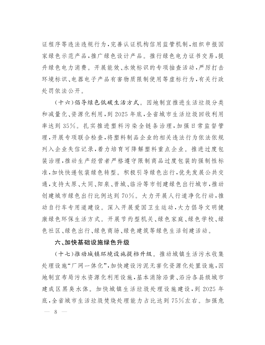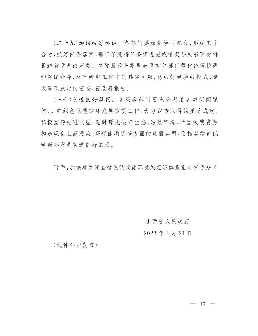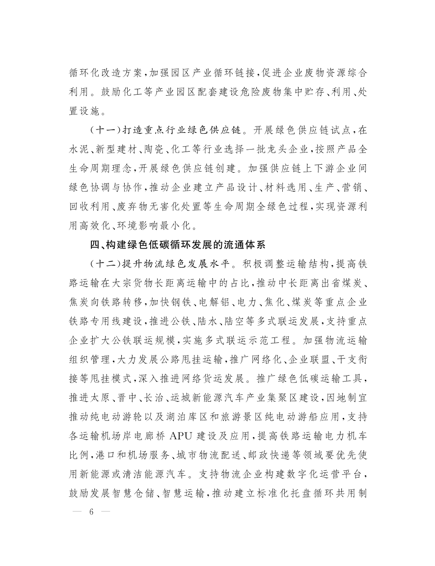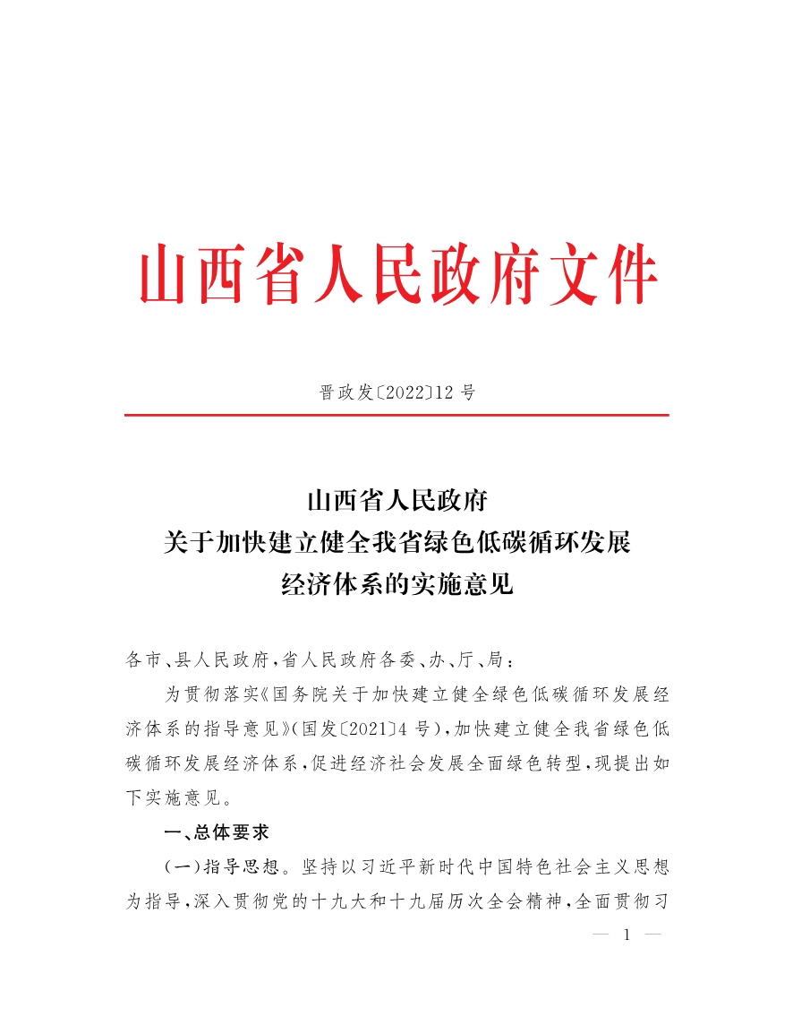 山西省人民政府日前發(fā)布關(guān)于<加快建立健全我省綠色低碳循環(huán)發(fā)展經(jīng)濟體系>的實施意見