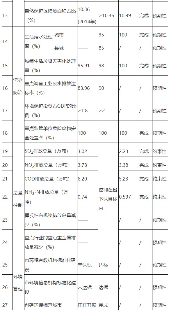 梅州市環(huán)境保護(hù)與生態(tài)建設(shè)“十三五”規(guī)劃實(shí)施情況總體良好,27項(xiàng)指標(biāo)中,除8項(xiàng)因統(tǒng)計(jì)口徑變化等原因缺乏數(shù)據(jù)外,其余19項(xiàng)全部完成規(guī)劃目標(biāo),其中城市空氣質(zhì)量?jī)?yōu)良天數(shù)比例、PM2.5年均濃度、地表水水質(zhì)優(yōu)良(達(dá)到或優(yōu)于III類(lèi))比例等主要約束性指標(biāo)超額完成目標(biāo)。資料庫(kù)_工程咨詢(xún)_模版下載
