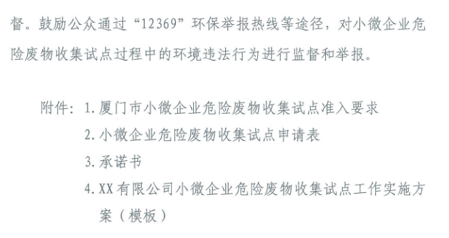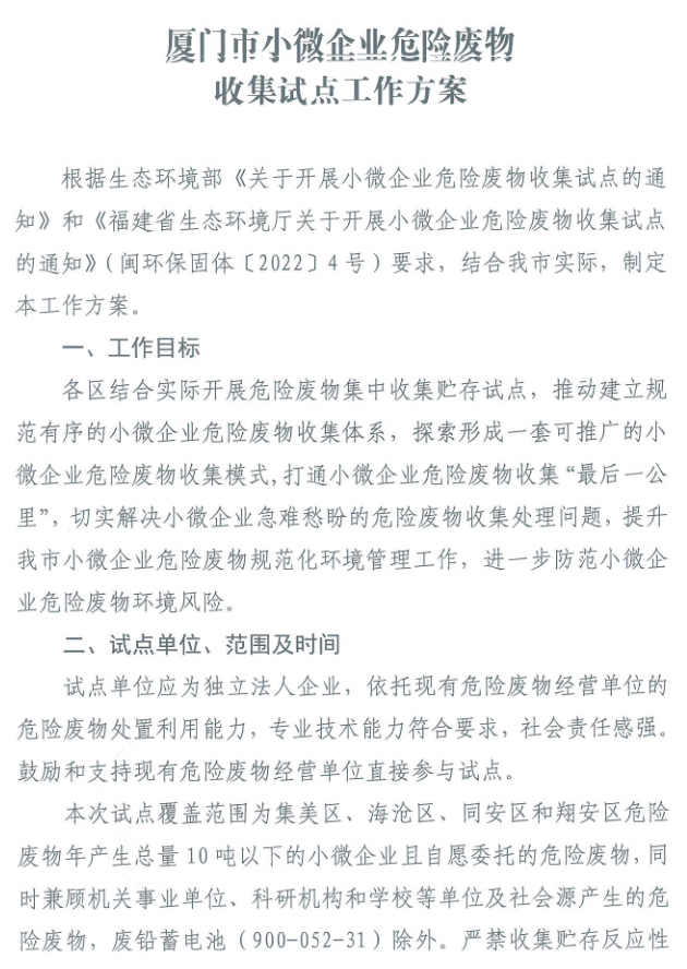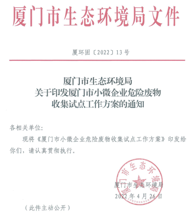 廈門(mén)市生態(tài)環(huán)境局印發(fā)<廈門(mén)市小微企業(yè)危險(xiǎn)廢物收集試點(diǎn)工作方案>的通知