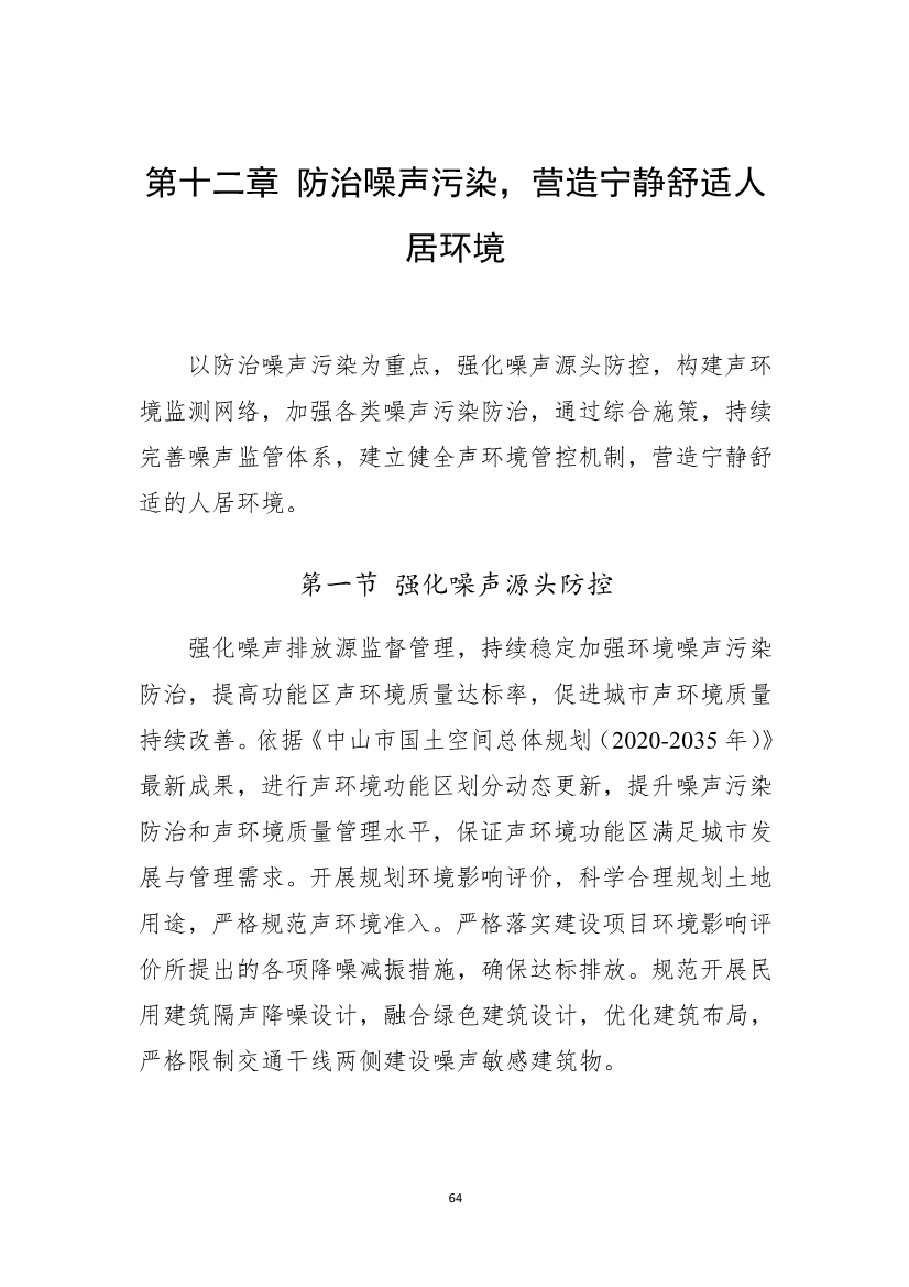 日前,中山發(fā)布《中山市生態(tài)環(huán)境保護(hù)“十四五”規(guī)劃》。《規(guī)劃》提出,以建設(shè)粵港澳大灣區(qū)為契機(jī),進(jìn)一步加大環(huán)境保護(hù)和生態(tài)建設(shè)力度,到 2025 年,優(yōu)化調(diào)整取水口,實(shí)現(xiàn)飲用水水源地集中保護(hù),增強(qiáng)水源地風(fēng)險(xiǎn)應(yīng)急響應(yīng)及處置能力。 加大環(huán)境綜合整治力度,基本消除黑臭水體,合理布局農(nóng)村分散式污水處理設(shè)施,加快生活垃圾無害化處理設(shè)施建 設(shè),基本實(shí)現(xiàn)城鄉(xiāng)環(huán)境基礎(chǔ)設(shè)施服務(wù)均等化。 主要污染物排放得到有效控制,內(nèi)河涌環(huán)境得到明顯改善,重要江河湖庫、近岸海域水質(zhì)逐步改善;加大空氣污染防控工作,消除連續(xù)大氣重污染天氣,積極推動(dòng)碳排放達(dá)峰; 土壤污染初步遏制,土壤環(huán)境質(zhì)量穩(wěn)中向好;各功能組團(tuán)環(huán)境功能明確,產(chǎn)業(yè)結(jié)構(gòu)協(xié)調(diào)、布局合理、生產(chǎn)高效的生態(tài)產(chǎn) 業(yè)體系建立完善,循環(huán)經(jīng)濟(jì)框架基本形成,居民環(huán)保意識(shí)進(jìn) 一步加強(qiáng),為實(shí)現(xiàn)美麗中山的目標(biāo)提供環(huán)境安全保障。