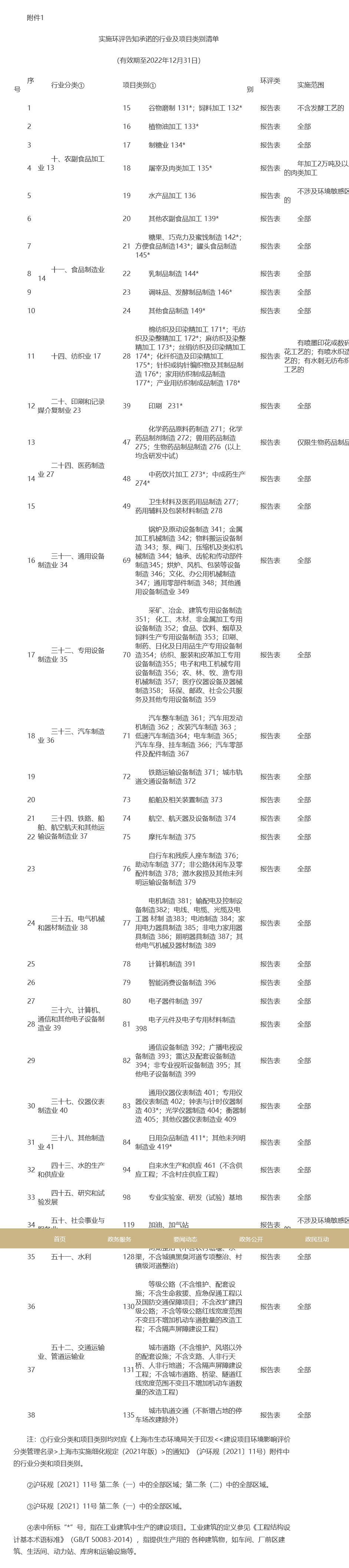 (二)擴(kuò)大環(huán)評告知承諾實(shí)施范圍。按照《上海市生態(tài)環(huán)境局關(guān)于印發(fā)的通知》(滬環(huán)規(guī)〔2021〕11號)的行業(yè)和項(xiàng)目分類,對醫(yī)藥制造業(yè)、研究和試驗(yàn)發(fā)展業(yè)、汽車制造業(yè)、交通運(yùn)輸業(yè)、農(nóng)副食品加工業(yè)等18個(gè)行業(yè)38類的建設(shè)項(xiàng)目(列入《上海市建設(shè)項(xiàng)目環(huán)境影響評價(jià)重點(diǎn)行業(yè)名錄(2021年版)》的建設(shè)項(xiàng)目除外)實(shí)施環(huán)評告知承諾,具體行業(yè)和項(xiàng)目類別見附件1。實(shí)施環(huán)評告知承諾的建設(shè)項(xiàng)目即來即辦,受理當(dāng)日完成環(huán)評審批。對位于自貿(mào)區(qū)臨港新片區(qū)、青浦區(qū)以及規(guī)劃環(huán)評與項(xiàng)目環(huán)評聯(lián)動(dòng)區(qū)域內(nèi)的建設(shè)項(xiàng)目可繼續(xù)按照既有政策實(shí)施環(huán)評告知承諾。