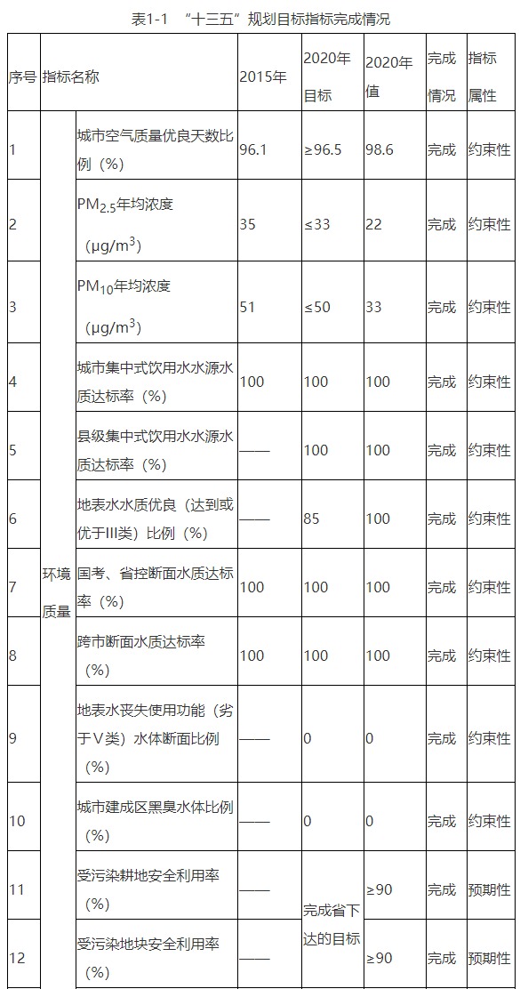 梅州市環(huán)境保護(hù)與生態(tài)建設(shè)“十三五”規(guī)劃實(shí)施情況總體良好,27項(xiàng)指標(biāo)中,除8項(xiàng)因統(tǒng)計(jì)口徑變化等原因缺乏數(shù)據(jù)外,其余19項(xiàng)全部完成規(guī)劃目標(biāo),其中城市空氣質(zhì)量?jī)?yōu)良天數(shù)比例、PM2.5年均濃度、地表水水質(zhì)優(yōu)良(達(dá)到或優(yōu)于III類)比例等主要約束性指標(biāo)超額完成目標(biāo)。