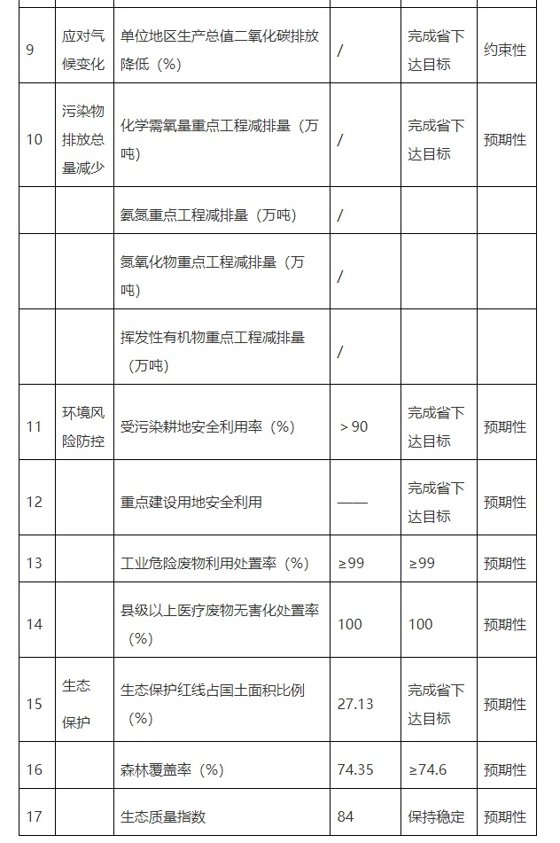 注:生態(tài)保護(hù)紅線為2020年12月省政府報(bào)送國(guó)家版本,后續(xù)以批復(fù)結(jié)果為準(zhǔn);生態(tài)質(zhì)量指數(shù)由于指標(biāo)核算方法尚未明確,暫采用省生態(tài)環(huán)境廳公布的2019年生態(tài)環(huán)境狀況指數(shù),2020年數(shù)據(jù)尚未公布;各項(xiàng)指標(biāo)的指標(biāo)屬性,與國(guó)家和省有關(guān)要求保持一致。