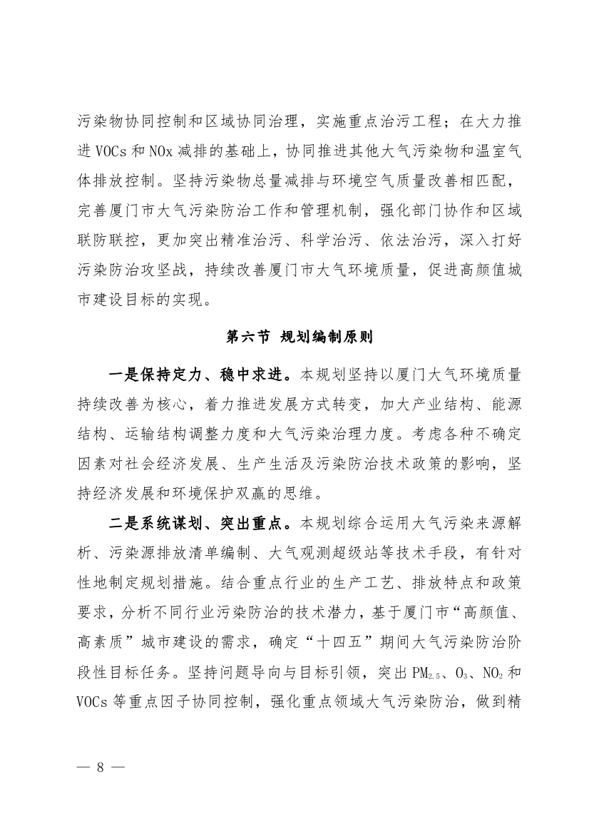 為堅決貫徹落實習(xí)近平生態(tài)文明思想,立足新發(fā)展階段、貫 徹新發(fā)展理念、積極服務(wù)并深度融入新發(fā)展格局,牢固樹立和踐 行“綠水青山就是金山銀山”的理念,堅定不移深入打好污染防治攻堅戰(zhàn),鞏固廈門市環(huán)境空氣質(zhì)量排名在全國 168 個重點城市 的領(lǐng)先地位,按照生態(tài)環(huán)境部下發(fā)的《“十四五”空氣質(zhì)量改善規(guī) 劃編制技術(shù)大綱》相關(guān)要求,圍繞廈門空氣質(zhì)量改善和主要污染物減排目標(biāo),廈門印發(fā)《廈門市“十四五”空氣質(zhì)量改善規(guī)劃》。