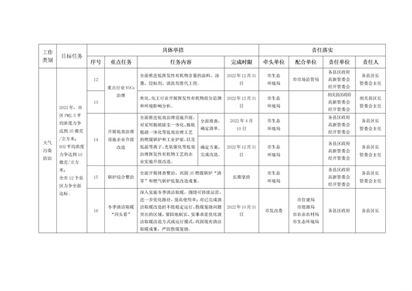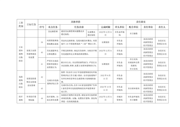 為全面加快推進(jìn)2022年生態(tài)環(huán)境工作,促進(jìn)全市生態(tài)環(huán)境質(zhì)量持續(xù)改善,力爭實(shí)現(xiàn)由量變到質(zhì)變的歷史性突破,按照國家、省生態(tài)環(huán)境工作部署,制定了《長治市2022年生態(tài)環(huán)境重點(diǎn)工作、重點(diǎn)任務(wù)工作矩陣》,主要涉及大氣污染防治(重點(diǎn)行業(yè)VOCs治理、重點(diǎn)行業(yè)超超低排放改造)、水污染防治(城鎮(zhèn)生活源污染治理、工業(yè)源污染治理、黑臭水體排查整治)、工業(yè)固體廢物污染防治(醫(yī)療廢物污泥無害化處置、轉(zhuǎn)移和傾倒工業(yè)固廢)、農(nóng)村污染防治、土壤污染防治、地下水污染防治等,詳情如下:
