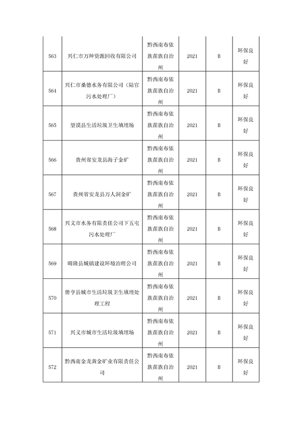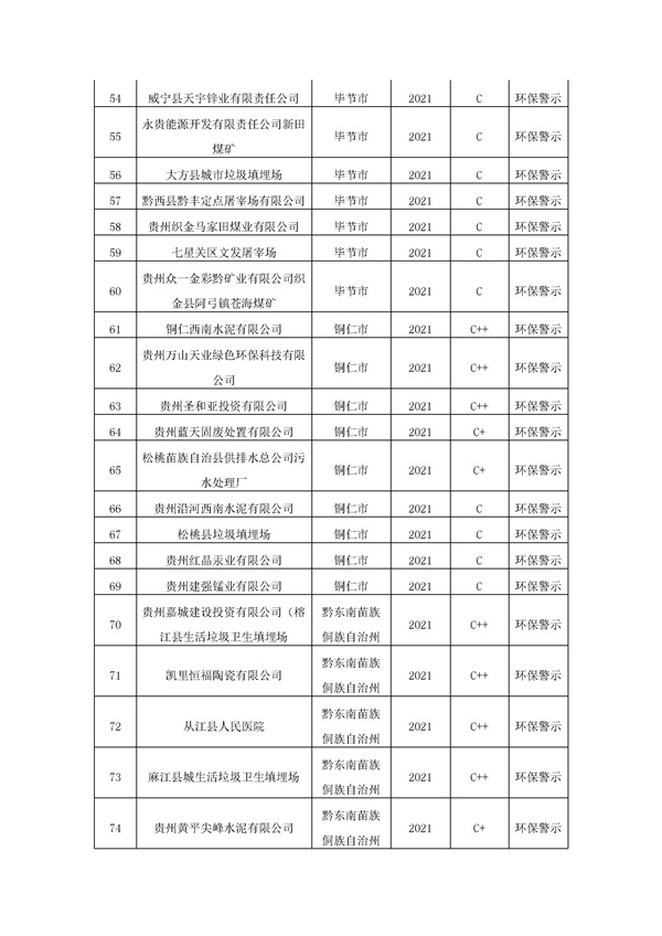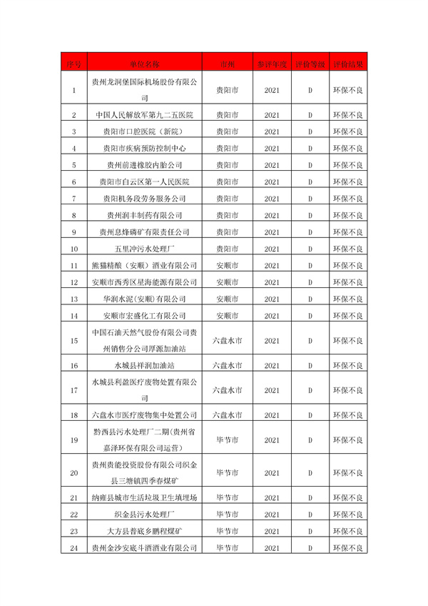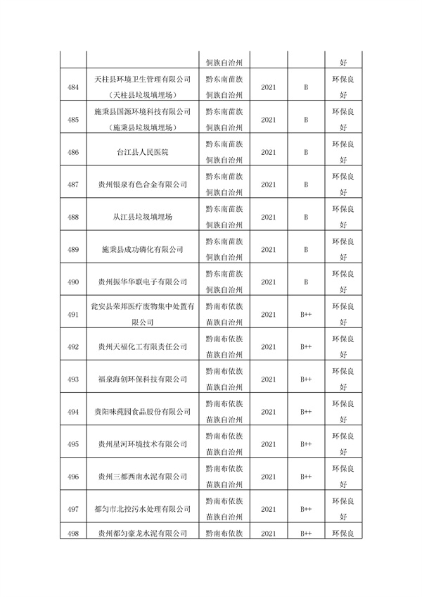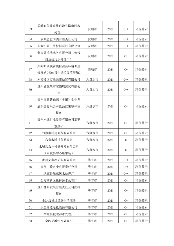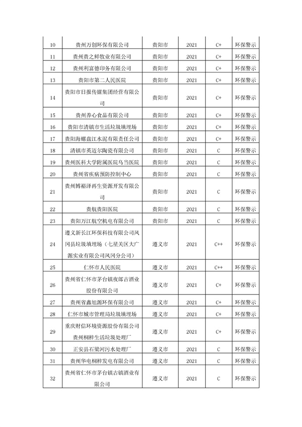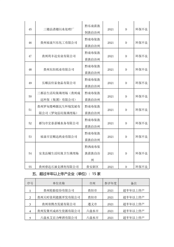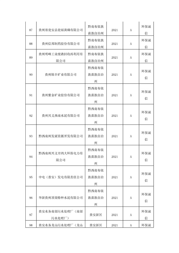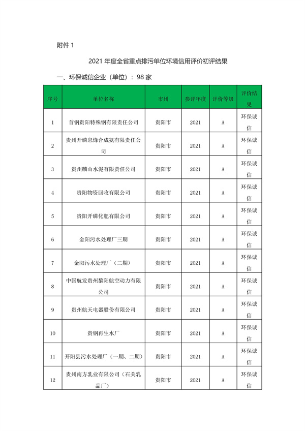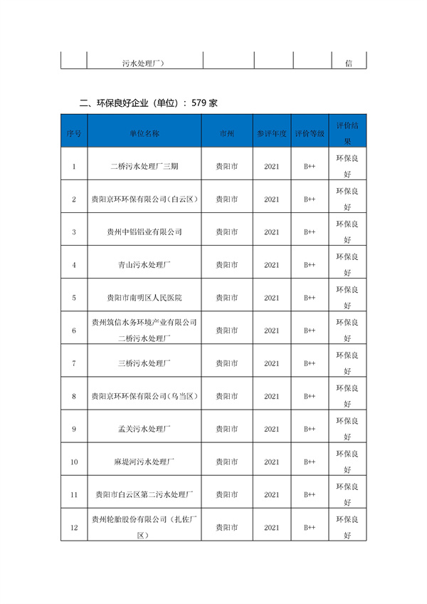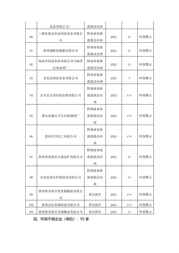 日前,貴州省公示了《2021年度全省重點排污單位環(huán)境信用評價初評結(jié)果》,98家環(huán)保誠信企業(yè)(其中污水處理廠占十余個名額),579家環(huán)保良好企業(yè),101家環(huán)保警示企業(yè)(其中涉及多個生活垃圾填埋場、生活垃圾處理廠、污水處理廠),55家環(huán)保不良企業(yè),15家超過半年以上停產(chǎn)企業(yè)。詳情如下: