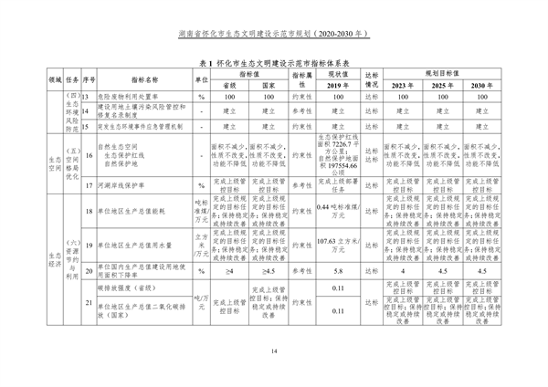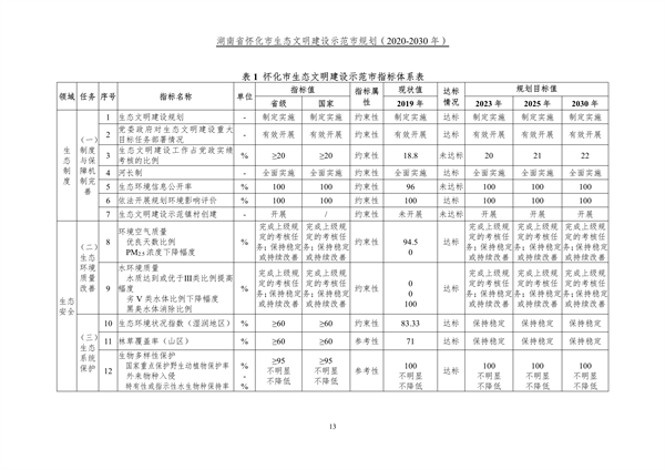 湖南省懷化市人民政府印發(fā)《湖南省懷化市生態(tài)文明建設(shè)示范市規(guī)劃(2020-2030年)》,懷化市生態(tài)文明建設(shè)示范市分別設(shè)置包括生態(tài)制度、生態(tài)安全、生態(tài)空間、生態(tài)經(jīng)濟(jì)、生態(tài)生活、生態(tài)文化六大領(lǐng)域十大任務(wù)36 項(xiàng)(國(guó)家)、36 項(xiàng)(省級(jí))指標(biāo)。堅(jiān)定“生態(tài)優(yōu)先、綠色發(fā)展”之路,牢牢把握武陵山片區(qū)高質(zhì)量發(fā)展的根本要求,堅(jiān)持生態(tài)美市,以?shī)^力建設(shè)“五省邊區(qū)生態(tài)文明中心城市”為總攬,建立健全生態(tài)文明制度體系、持續(xù)改善生態(tài)環(huán)境質(zhì)量、進(jìn)一步優(yōu)化空間開(kāi)發(fā)格局、顯著提高生態(tài)經(jīng)濟(jì)發(fā)展水平、實(shí)現(xiàn)綠色生活方式轉(zhuǎn)型、全面增強(qiáng)全社會(huì)生態(tài)文明理念,率先建成人與自然和諧共生的美麗懷化。詳情如下: